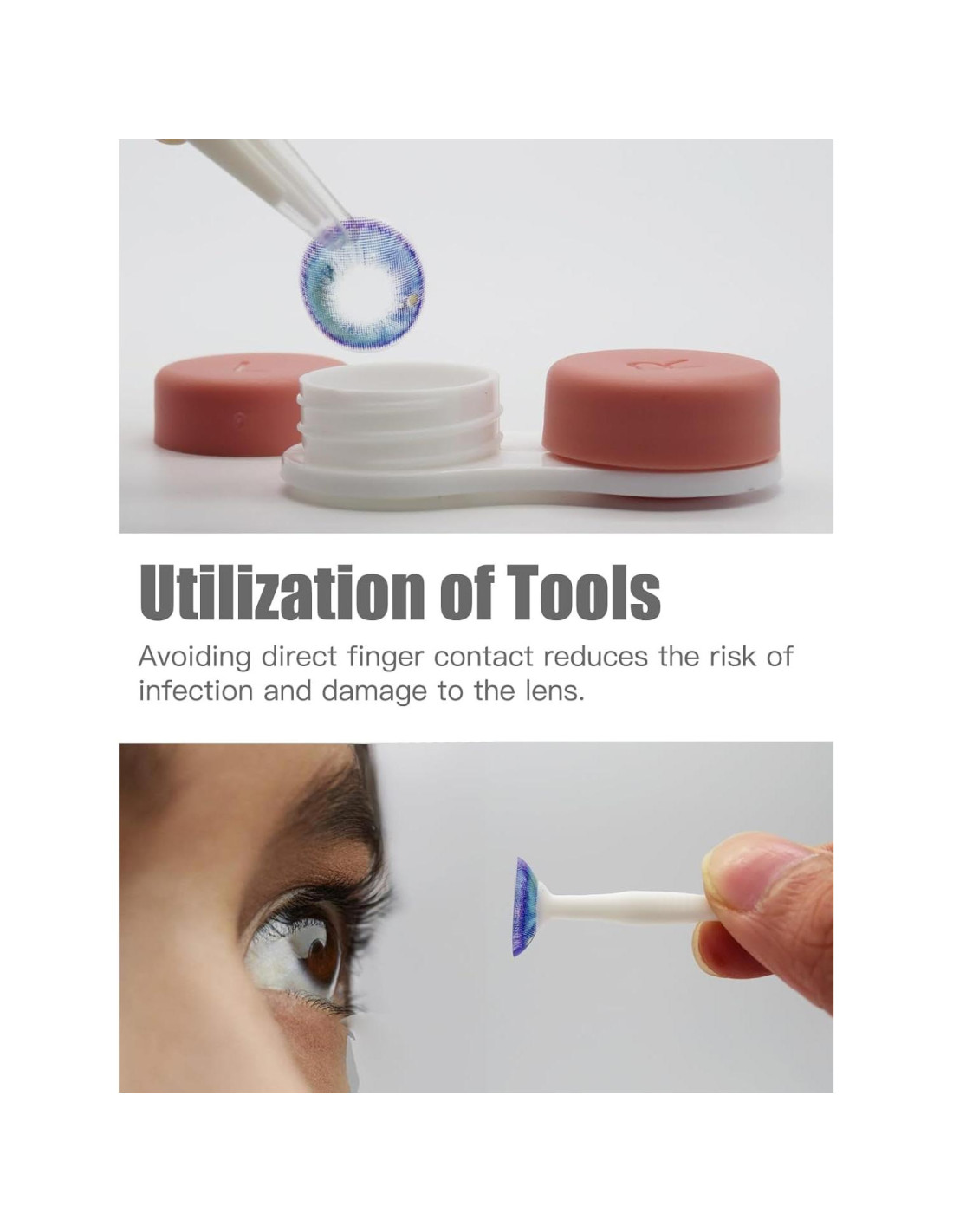 - Herramienta de Aplicación y Removedor de Lentes de Contacto - Cada paquete viene con las herramientas prácticas que necesitas para el cuidado diario de tus lentes de contacto. Un estuche para lentes de contacto para remojar y almacenar los lentes. Un palo de succión y unas pinzas para ayudarte a aplicar y quitar tus lentes de contacto de color sin tener que tocarlos directamente.