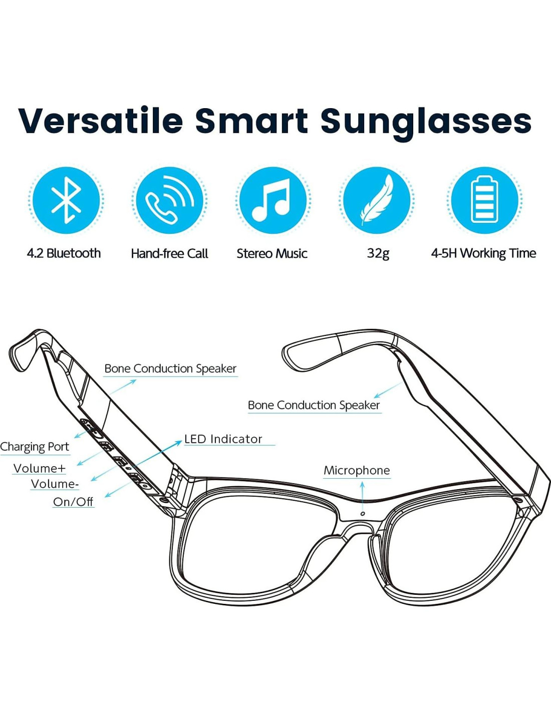 - Llamadas Manos Libres y Podcasts: Estas gafas inteligentes inalámbricas eliminan la necesidad de manejar teléfonos mientras se conduce o se corre. Controle el volumen, las llamadas y la música sin esfuerzo con los botones del marco. Para una escucha óptima, mantenga los dispositivos Bluetooth al 50%-60% de volumen; niveles más altos pueden causar fugas de sonido o eco durante las llamadas