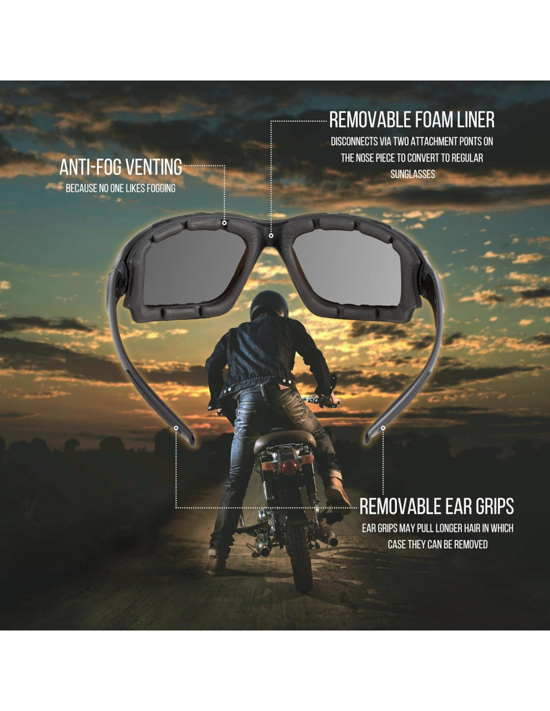 - CARACTERÍSTICAS - Forro ocular resistente al viento removible; Opción de convertir a gafas de protección con la correa trasera incluida; Piezas de oído removibles de goma ayudan a mantener la estabilidad y el agarre en la cabeza del usuario; Diseño ligero ideal para motocicleta y ciclismo, conducción, correr, pescar, carreras, esquiar, escalar, hacer senderismo, navegar y/o otras actividades al aire libre