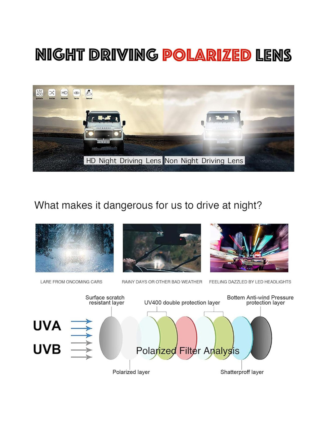 - Un par de lentes de visión nocturna HD: Lentes amarillos polarizados reducen el deslumbramiento al conducir de noche y la fatiga ocular, mejoran la visión nocturna, mejoran la claridad del color y la definición óptica, lente de alta definición te brinda una visión natural y clara. Protege tus ojos de elementos ambientales adversos, como reflejos inesperados, faros brillantes y los dañinos rayos del sol.