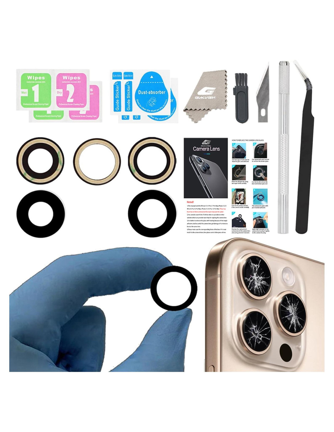 - [Reemplazo Más Fácil] El artículo incluye todas las herramientas de reparación profesionales que necesitas durante el reemplazo. No es necesario desensamblar tu teléfono. El cristal de la cámara viene con adhesivo de doble cara original, sigue nuestro Manual de Instalación paso a paso para completar el proceso de reparación más rápido.