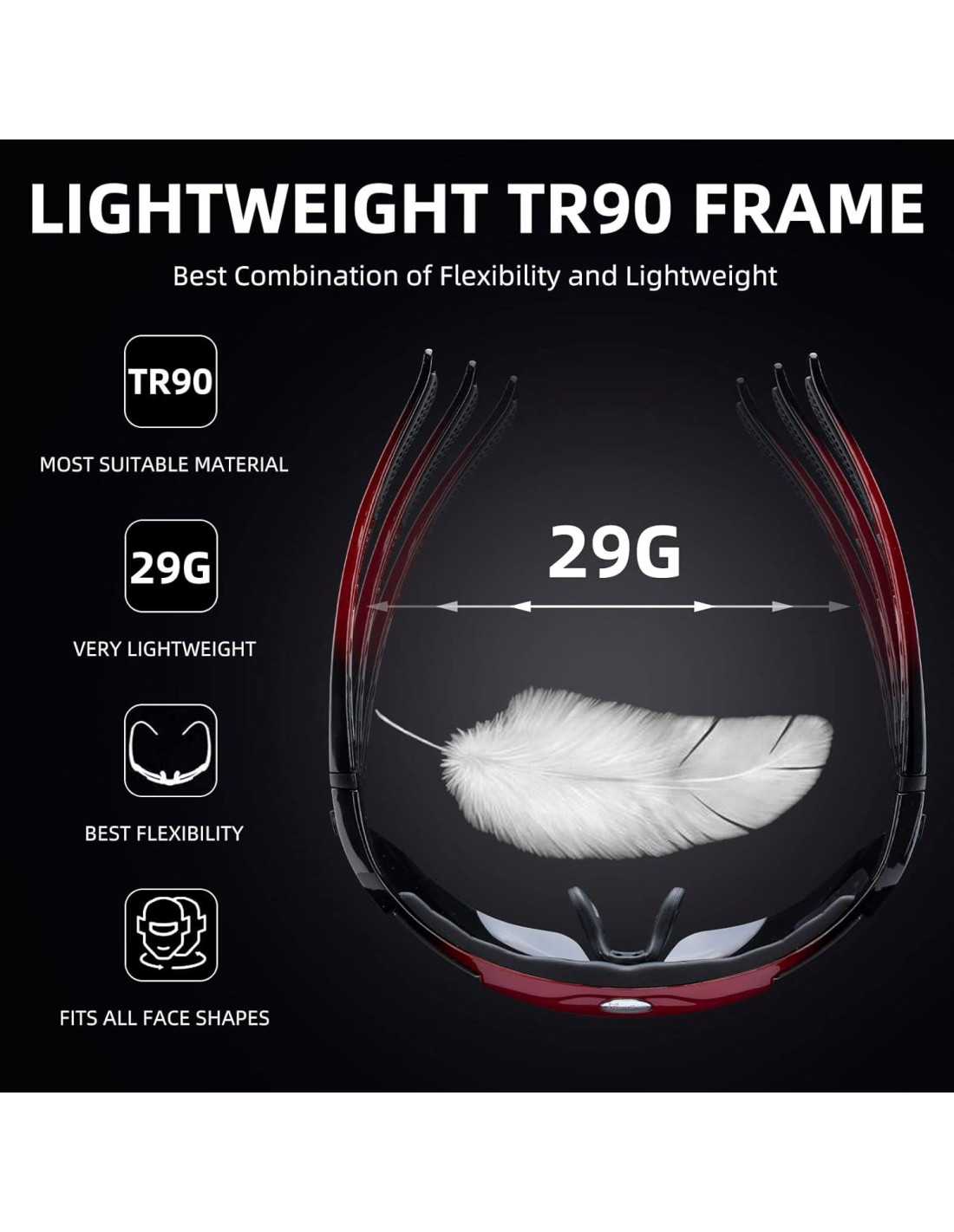- LIGERO: Solo 29g/pair (0,03 kg), ideal para usar durante largos períodos de tiempo. Las gafas de ciclismo ultraligeras reducen la presión en tu nariz y sienes