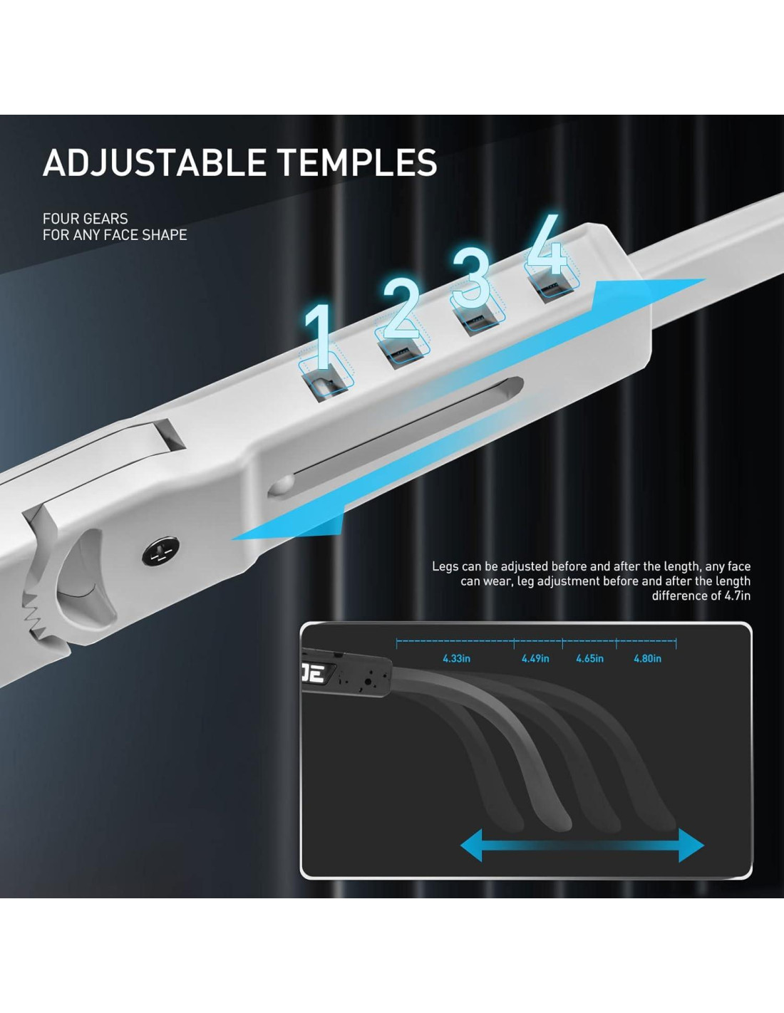 - Piernas Ajustables en 8 Niveles El diseño oculto de las piernas permite cuatro ajustes de longitud diferentes, mientras que la curvatura de las piernas se puede ajustar en cuatro posiciones diferentes para asegurar el mejor ajuste para la forma de tu cara. El marco diseñado ergonómicamente mantiene las gafas a la altura perfecta, haciéndolas adecuadas para todas las formas de cara.