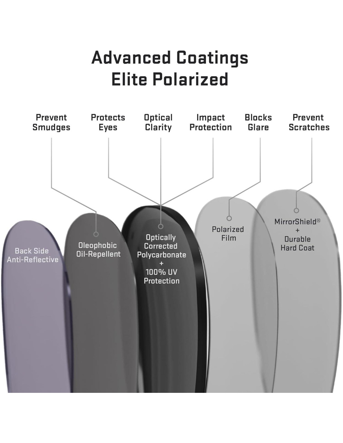 - RECUBRIMIENTOS PREMIUM ELITE - Los lentes espejados cuentan con un recubrimiento en la parte frontal que resiste el agua, permitiendo que se deslice fácilmente para una vista más clara.
