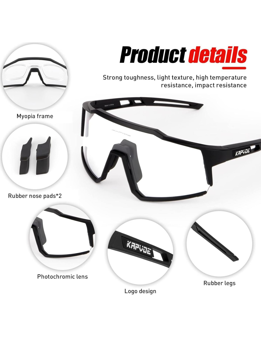 - Marco de Miopía Incorporado Incluye un marco de miopía en el paquete de gafas de ciclismo, conveniente para que configures gafas con receta. Las patillas de las gafas de montaña fotoquímicas KAPVOE son flexibles y tienen clips nasales de goma suave, adecuados para diferentes formas de cara.