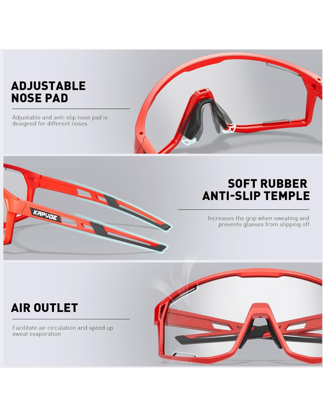 - Gafas Fotoquímicas KAPVOE las lentes fotoquímicas se oscurecen o aclaran en respuesta a los cambios en la luz exterior, con una transmisión de luz visual que varía del 15% al 85%. Las gafas de sol fotoquímicas cambiarán de claras a gris oscuro en condiciones soleadas, protegiendo efectivamente los ojos y manteniendo un nivel de brillo cómodo.