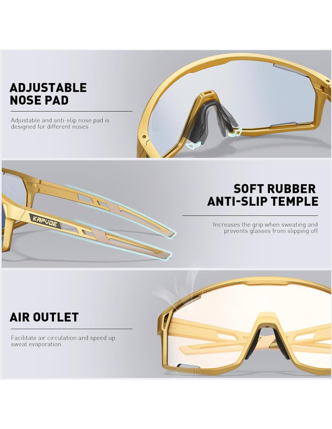 - Gafas Fotoquímicas KAPVOE con lentes fotoquímicos que se oscurecen o aclaran en respuesta a los cambios en la luz exterior, con una transmisión de luz visual que varía del 15% al 85%. Las gafas de sol fotoquímicas cambiarán de claras a gris oscuro en condiciones soleadas, protegiendo efectivamente los ojos y manteniendo un nivel de brillo cómodo.