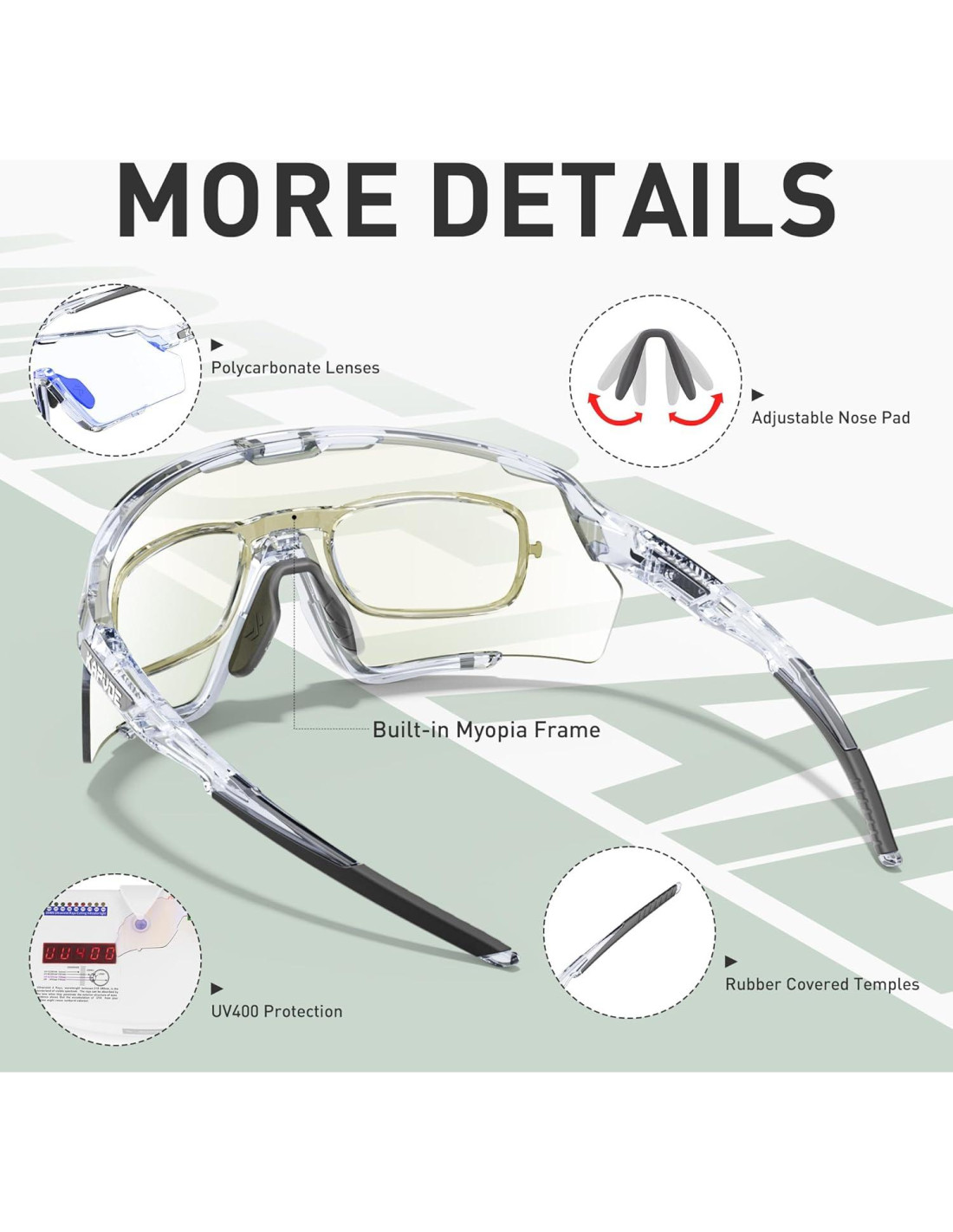 - [Lente PC Fotochromic] La lente fotochromic cambiará de clara a color profundo en respuesta a la intensidad de la radiación ultravioleta. Estas gafas de sol deportivas de transición se activan con los rayos UV para oscurecerse cuando están expuestas al sol, y cuando la luz disminuye o entras en un lugar cerrado, las lentes vuelven suavemente a ser claras. Este proceso de transición suave ayuda a aliviar la fatiga ocular por cambios rápidos de luz.