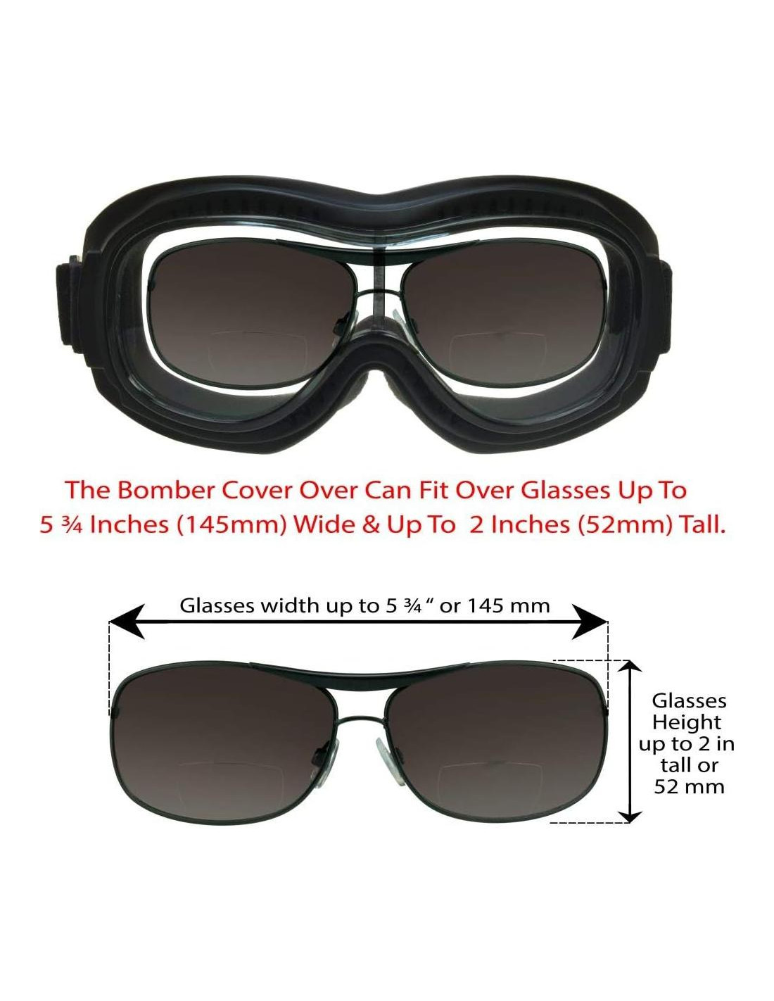 - SE ADAPTA A GAFAS DE HASTA 5 3/4 PULGADAS (145mm) DE ANCHO Y HASTA 2 PULGADAS (52mm) DE ALTO: Por favor, mide tus gafas antes de comprar estas gafas para asegurarte de que encajen. Mide tus gafas desde la parte exterior de la patilla izquierda hasta la parte exterior de la patilla derecha. También mide la altura de las gafas desde la parte superior hasta la parte inferior del marco. Ten en cuenta que estas gafas están diseñadas para ajustarse cómodamente sobre las gafas.