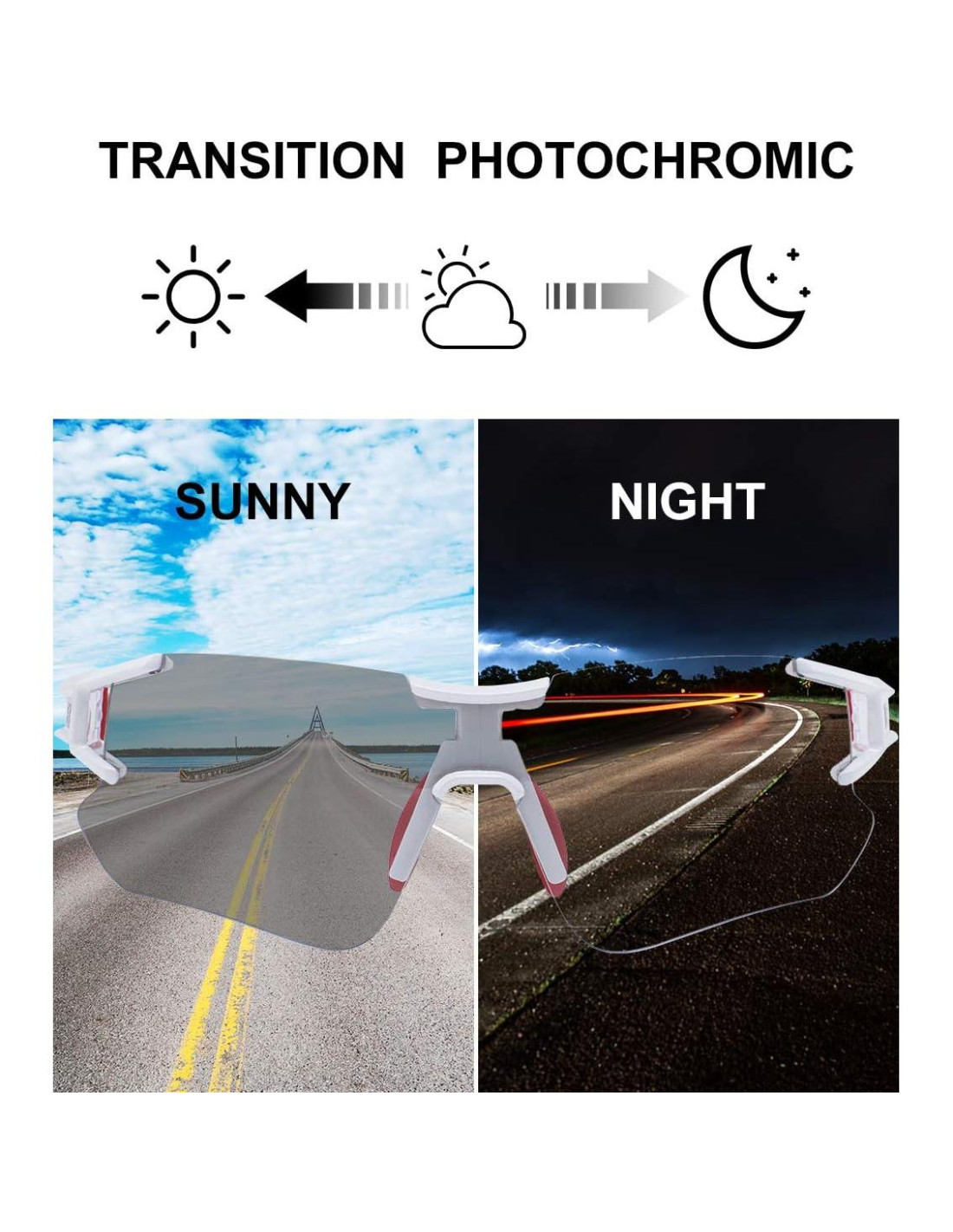- TECNOLOGÍA FOTOQUÍMICA: Las gafas de sol para ciclismo con lentes inteligentes se aclaran o oscurecen automáticamente en respuesta a las condiciones de luz cambiantes sin necesidad de cambiar entre gafas. Construcción sin marco que te brinda una visión periférica más clara para evitar que el marco bloquee tu vista