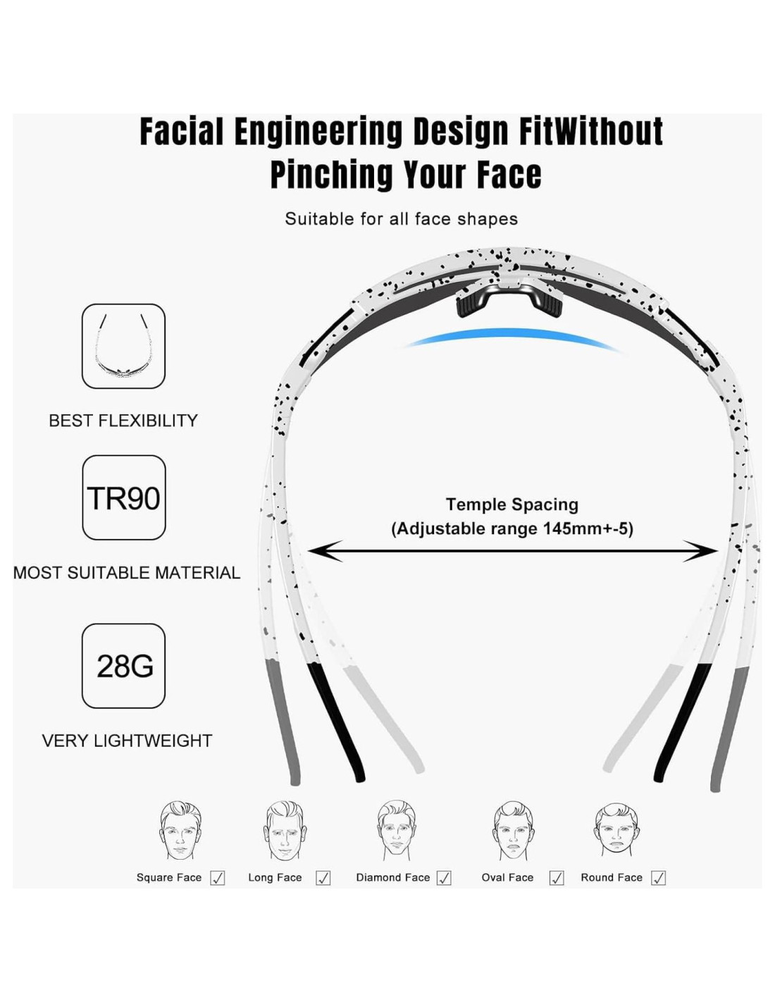 - Gafas de sol deportivas para hombres y mujeres cuentan con inserciones listas para prescripción, eliminando la molestia de usar dos pares de gafas para ciclistas y jugadores de béisbol. El marco se adapta al 95% de las formas de cara de adultos