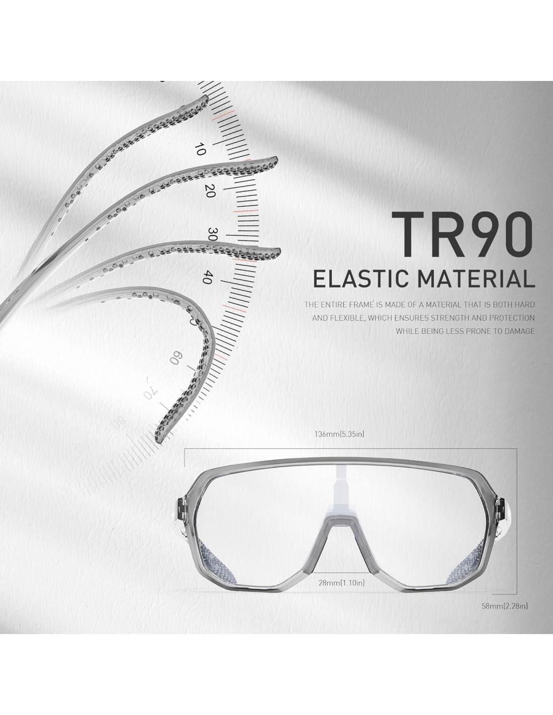 - Diseño de Goma Cómoda Estas gafas de bicicleta de montaña fotoquímicas están equipadas con almohadillas nasales de goma suave y un marco flexible TR90 que te brindan una experiencia de uso más cómoda, pueden adaptarse a diferentes formas de cara.