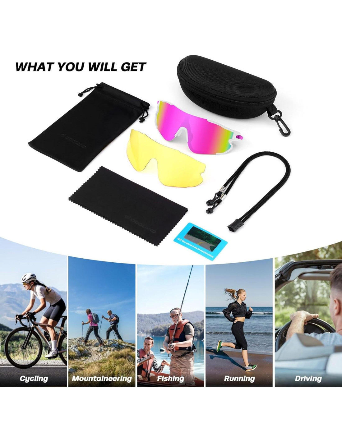 - Paquete Incluido: gafas deportivas *1, lentes de visión nocturna reemplazables *1, caja EVA *1, bolsa para gafas *1, paño de limpieza para gafas *1, tarjeta de prueba de gafas polarizadas *1, cuerda para gafas *1