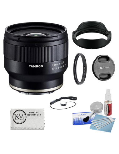 Incluido con el Tamron 20mm f/2.8 Di III OSD M 1:2 Lente Tamron 20mm f/2.8 Di III OSD M 1:2 Lente para Sony E Capucha de Lente Tapa de Lente Frontal Tapa de Lente Trasera Garantía Limitada del Fabricante de 6 Años También Incluido en este Paquete K&M están: Tamron 20mm f/2.8 Di III OSD M 1:2 Lente para Sony E Sujetador de Tapas de Lente Filtro UV de 67mm Kit de Limpieza de Cámara y Lente de 5 Piezas con Soplador, Cepillo, Líquido, Paño, Tejidos y Consejos Paño de Limpieza de Microfibra Características Clave del Tamron 20mm f/2.8 Di III OSD M 1:2 Lente Lente de Montura E/Formato de Fotograma Completo Rango de Apertura: f/2.8 a f/22 Tres Elementos de Baja Dispersión Un Elemento Asférico Recubrimiento BBAR Motor de Paso OSD 1:2 Magnificación, 10.9 cm Mín. Enfoque Diseño Resistente al Agua, Recubrimiento de Flúor Diafragma Redondeado de 7 Palas Resumen del Tamron 20mm f/2.8 Di III OSD M 1:2 Lente Elegante y ultra-ancho describen el 20mm f/2.8 Di III OSD M 1:2 Lente de Tamron; un prime de gran angular flexible diseñado para cámaras sin espejo de montura E de Sony de fotograma completo. Este lente utiliza una apertura máxima modestamente brillante para lograr un perfil delgado y ligero que es ideal para disparos cotidianos. También contribuyendo a su versatilidad es una relación de magnificación máxima de medio tamaño 1:2 y una distancia mínima de enfoque de 10.9 cm para trabajar con sujetos en primer plano.