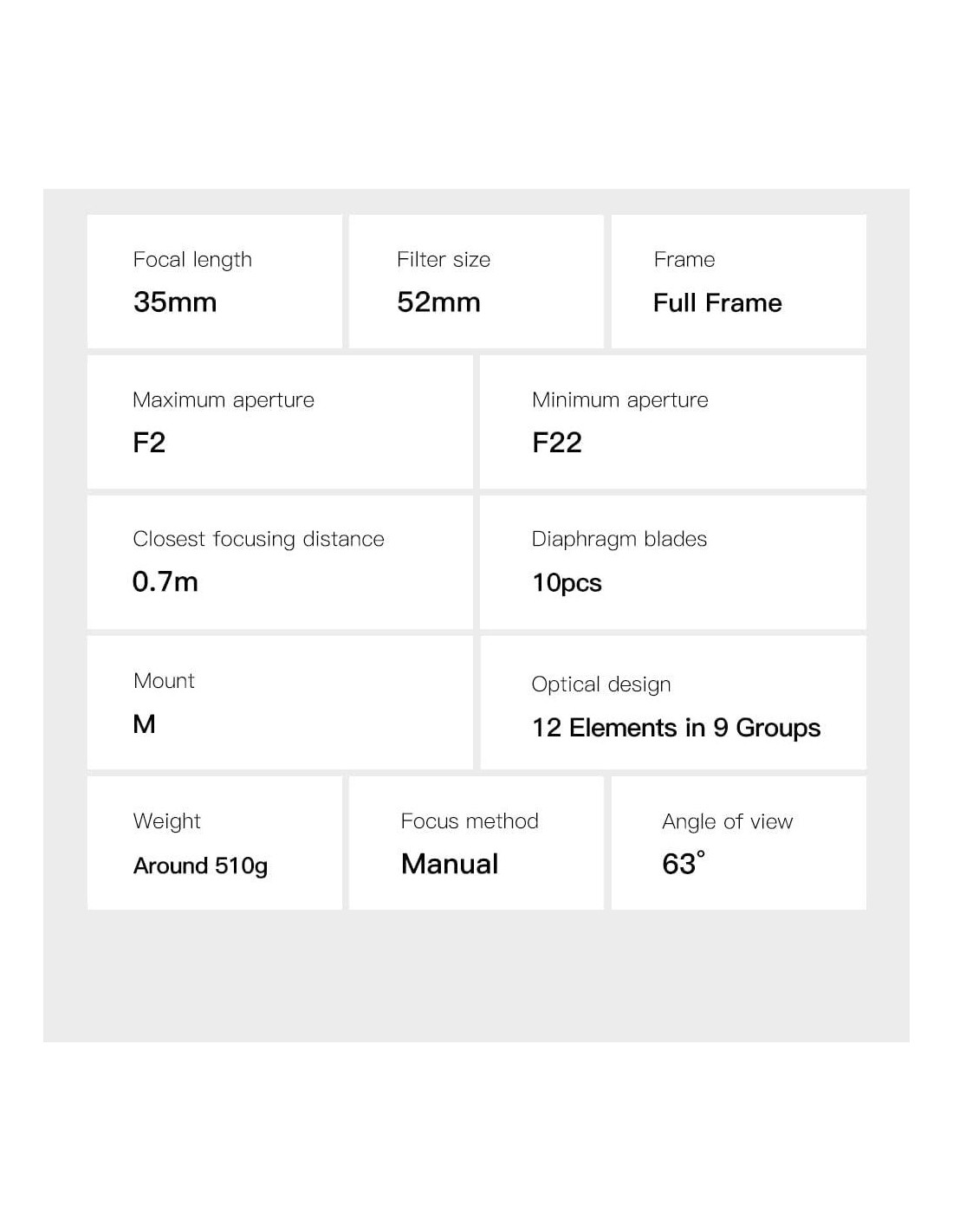 TTArtisan APO M35mm F2 AA Con un Adaptador de Lente TTArtisan LM-X1D * Soporta adaptar esta lente a cámaras de Montura Hasselbald (pero tiene un poco de viñeteo) - Breve Introducción * Especificaciones: - Longitud Focal: 35mm - Tipo de Marco: Formato Completo - Modo de Enfoque: Enfoque Manual - Diseño Óptico: 12 Elementos en 9 Grupos - Palas de Diafragma: 10pcs - Rango de Apertura: F2-F22 - Distancia de Enfoque Más Cercana: 0.7m - Ángulo de Visión: 63 - Peso: Aproximadamente 510g - Montura Compatible: para Montura Leica M - Característica: Soporta uso con un adaptador para adaptarse a otras cámaras * Estilo Retro Clásico: Cuerpo de metal, duradero y compatible. Con tapa de lente de goma TPU, ligera, firme y bien protegida. * Soporta Enfoque Macular: Soporta el enfoque macular de cámaras Leica/Voigtlander/Minolta y otras cámaras de puerto m-paraxial. * Gran apertura F2: Asegura suficiente luz, mejora la calidad de la imagen y permite tomar fotos en entornos de poca luz. * Longitud Focal de 35mm: Buena longitud para fotografía de retrato, y el ángulo de visión es cercano al ojo humano, compatible con muchos tipos de sujetos fotográficos.
