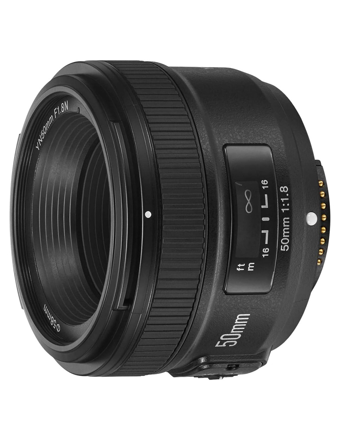 YN50mm F1.8 N, es una gran lente prime que es una excelente adición a la lente de kit de Nikon de 12-50mm. Esta lente te da 3 pasos o ocho veces (2x2x2) más luz que las lentes de kit estándar f/5.6. Gran lente para tomar retratos, fotografía en condiciones de poca luz, calle, disparos casuales y uso diario. Compatible con Nikon D3000 D3100 D3200 D3300 D5000 D5100 D5200 D5300 D5500 D80 D90 D7000 D7100 D7200 D7300 D300 D300S D500 D700 D800 D800E D810 D810A D3X D4 D4S D5. El montura de la lente está equipada con un anillo de goma a prueba de polvo y agua, que puede resistir efectivamente la entrada de polvo y gotas de agua. 1, Apertura F/1.8 grande que ayuda a separar el sujeto del fondo; 2, Una gran lente prime que es una excelente adición a la lente de kit de Nikon de 12-50mm; 3, Soporta modos de enfoque automático y manual; 4, Adopta contactos metálicos chapados en oro, que mejoran efectivamente la conductividad de la señal y la resistencia a la corrosión; 5, Soporta modos de disparo de cámara M/AV/TV/P y los parámetros utilizados para tomar fotos pueden ser mostrados en la Información EXIF; 6, Soporta cámaras de formato completo y APS-C; 7, Adopta plástico de alta calidad como estructura externa, el peso total es de solo 200g, lo que es conveniente para disparos al aire libre. 8, Cristal multicapa, mejora efectivamente la transmitancia y la resistencia al destello.