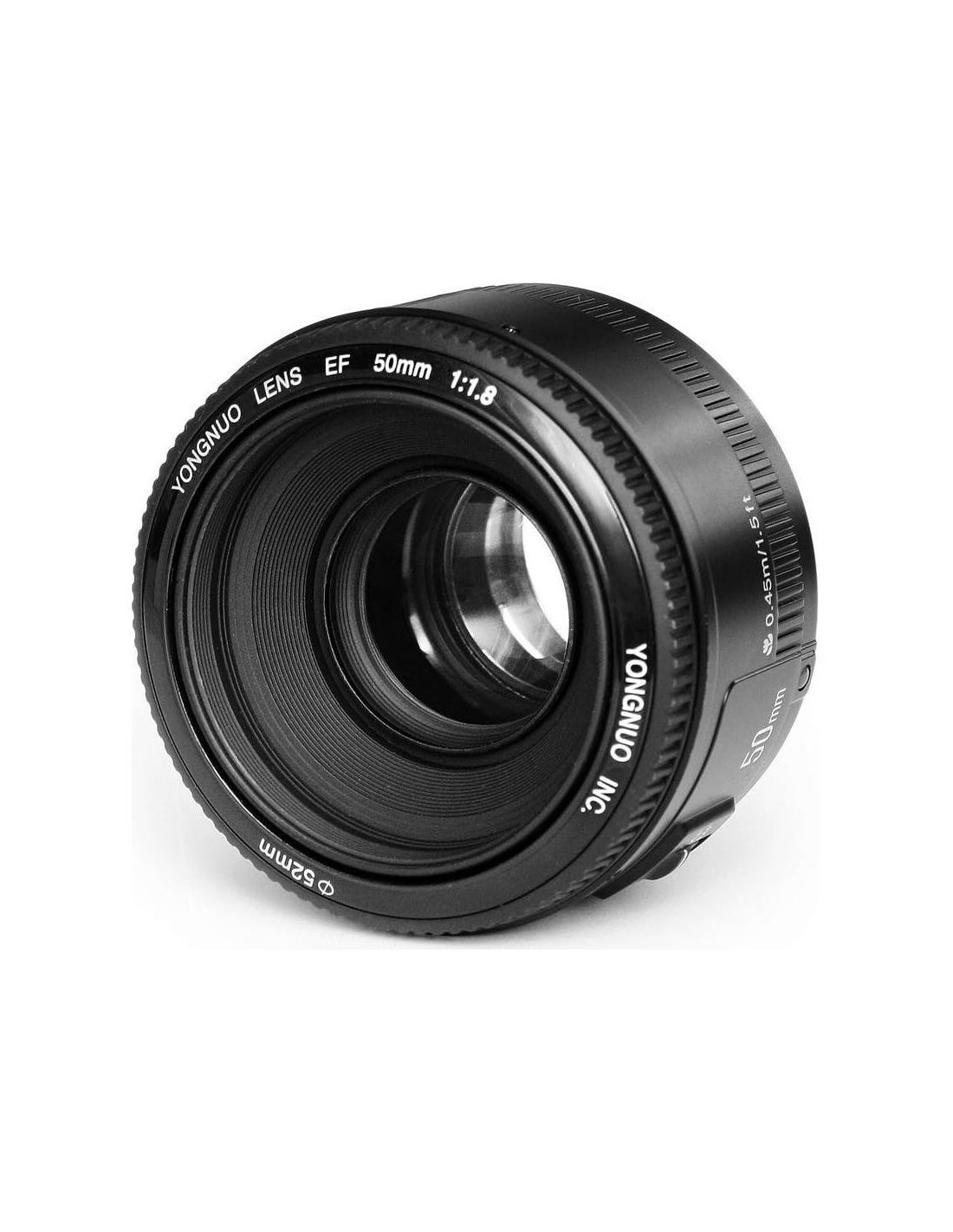 Característica: Soporta modos de disparo de cámara M/AV/TV/P y puede mostrar los datos de apertura en la Información EXIF. Soporta cámaras de formato completo y APS-C. Lentes multicapa, mejoran efectivamente la transmitancia. Proporciona una apertura mucho más rápida para uso en condiciones de poca luz y tiene mejor nitidez de borde a borde. También funciona bien con cámaras como la 5D, 7D, 60D, 70D, T3, T3i, T5, T5i, entre otras. Especificación: Enfoque Automático o Manual 5.08 cm de Longitud 0.15 Magnificación 46 Grados Ángulo Máximo de Visión 6 Elementos en 5 Grupos Acepta Filtros de 52mm Cobertura del Ángulo de Visión Diagonal: 46 Grados Vertical: 27 Grados Horizontal: 40 Grados Estructura de Lente: 5 conjuntos, 6 piezas Apertura Mínima: F/22 Distancia Mínima de Enfoque: 0.45m Magnificación Máxima y Rango de Visión: 0.15X / 160x240mm (cuando la distancia es 0.45m) Diámetro del Filtro / Cantidad Disponible: 52mm / 1 Diámetro Máximo y Longitud: 73.55mm Contenido del Paquete: 1 x Lente Prime YN50mm F1.8 1 x Tapa de Lente Delantera y Trasera 1 x Tapa de Lente de 52mm 1 x Manual 1 x Caja Original