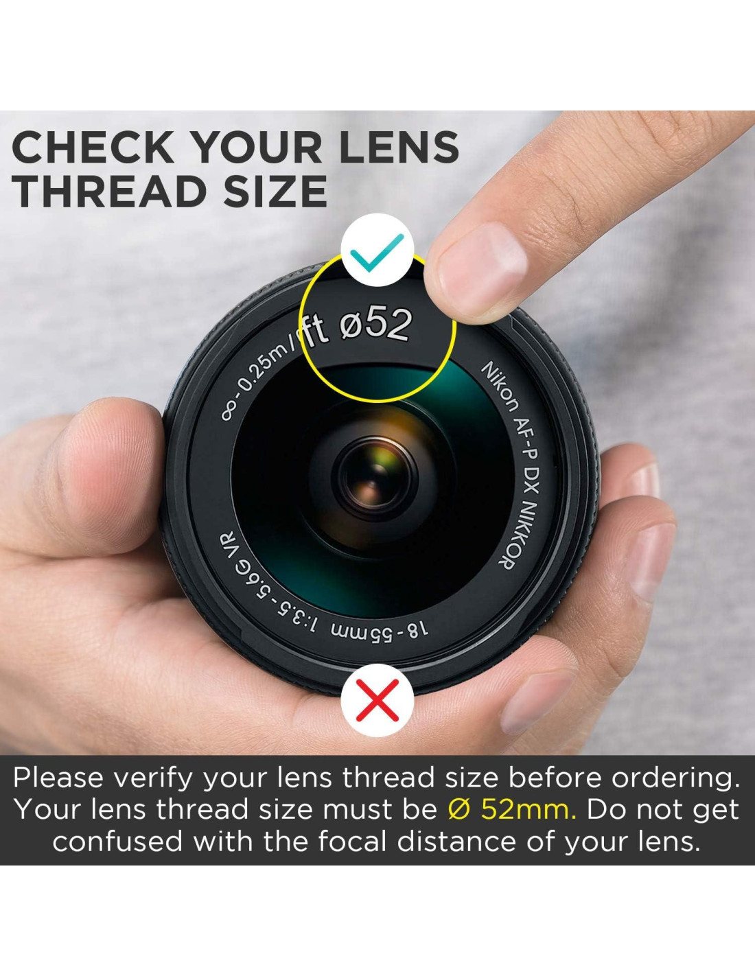 - COMPATIBILIDADES DE LENTES: Modelos populares de lentes de 52MM incluyendo Nikon AF-S DX NIKKOR 55-200mm f/4-5.6G ED VR II, Nikon AF-S DX NIKKOR 35mm f/1.8G, Canon RF 35mm f/1.8 es Macro STM, Canon EF-S 24mm f/2.8 STM, Canon EF-M 55-200mm f/4.5-6.3 IS STM, Sigma 30mm F1.4 Contemporary DC DN para Canon EF-M, Sigma 30mm F1.4 Contemporary DC DN para Sony E, FUJIFILM XC 15-45mm f/3.5-5.6 OIS PZ, FUJIFILM XF 35mm f/1.4 R, Panasonic Lumix G Vario 45-150mm f/4-5.6 ASPH. MEGA O.I.S.