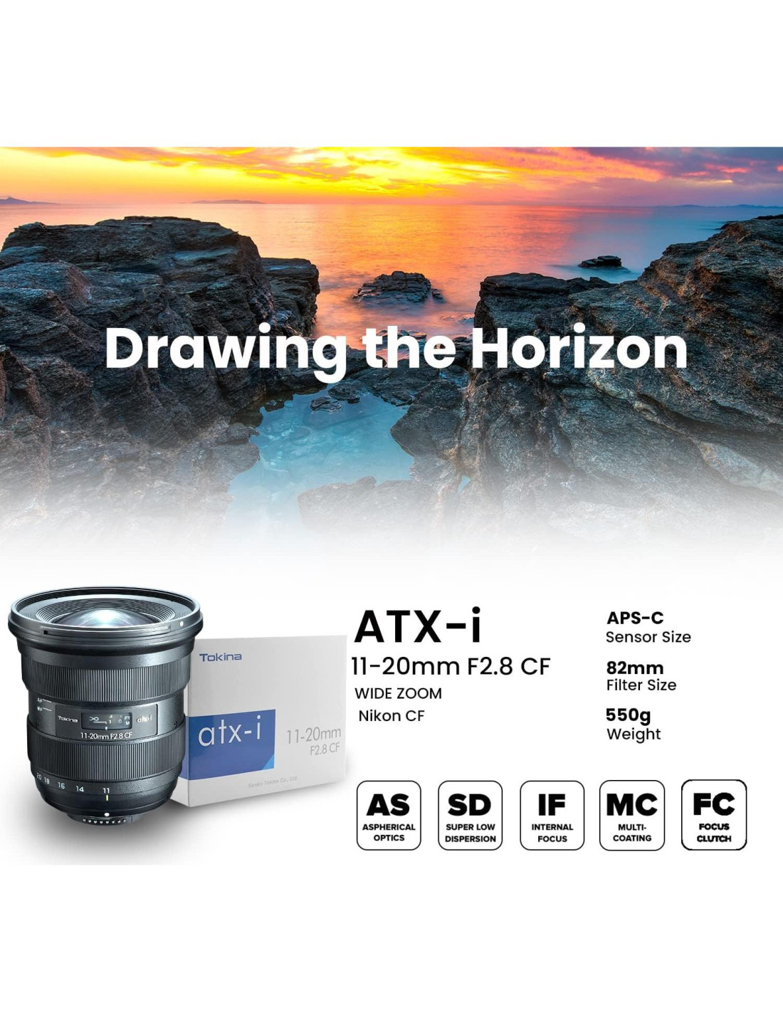 Basado en el popular modelo AT-X 11-20 F2.8 PRO DX, el atx-i 11-20mm F2.8 CF fue rediseñado y optimizado para cámaras DSLR con sensor APS-C contemporáneas en términos de especificaciones mejoradas y un diseño renovado, teniendo en cuenta las demandas de fotógrafos y creadores de contenido en video. Longitud focal de 11-20mm que cubre el ángulo equivalente de lentes fijos de 18mm, 21mm, 24mm, 28mm, hace que este lente sea atractivo para ser elegido después de un lente zoom estándar o un lente zoom gran angular inicialmente poseído. Una apertura máxima constante de f/2.8 a lo largo de todo el rango de zoom se realiza para lograr grandes resultados en condiciones de poca luz, para el control de la profundidad de campo y la facilidad de disparo manual, mientras se mantiene un tamaño y peso razonables. Para lograr un rendimiento óptico excepcional requerido para un lente zoom ultra gran angular, se utilizaron 3 elementos de vidrio asférico y 3 elementos de vidrio de dispersión super baja para minimizar la distorsión, gestionar la aberración esférica y el astigmatismo, logrando una excelente resolución de borde a borde y alto contraste a través de toda la imagen. El recubrimiento multicapa antirreflectante mejora la transmisión de luz y minimiza los reflejos, mientras que el nuevo recubrimiento repelente al agua facilita el limpiado y la limpieza de la superficie del elemento de vidrio frontal. Apertura mínima f/22 Apertura máxima f/2.8 Formato APS-C Recubrimiento Multicapa Configuración de lente 12 grupos, 14 elementos Ángulo de visión 104 ~ 72 Distancia mínima de enfoque 0.28m Relación macro 1 : 8.62 Método de enfoque Enfoque interno Hojas de diafragma 9 Tamaño de filtro 82mm Longitud total Montura Nikon F: 91.8mm Diámetro máximo 89mm Peso Montura Nikon F: 550g Parasol BH-821