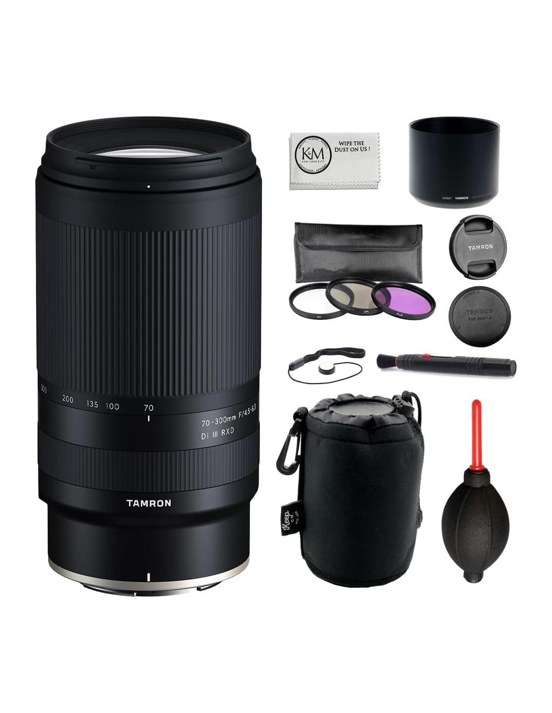 Tamron 70-300mm f/4.5-6.3 Di III RXD Lente para Nikon Z Características: Lente de Montura Z/Formato de Fotograma Completo Elemento Frontal de Baja Dispersión Motor AF de Paso RXD Diafragma de 7 Palas Redondeadas Rango de Apertura: f/4.5 a f/22 Recubrimiento Antirreflejo BBAR Construcción Resistente a la Humedad Qué Hay en la Caja Lente Tamron 70-300mm f/4.5-6.3 Di III RXD para Nikon Z Tapa Frontal de Lente Tamron SP (67mm) Tapa Trasera de Lente Parasol Garantía Limitada del Fabricante de 6 Años Este Paquete También Incluye: (1) Juego de Filtros de 67mm - UV, Polarizador Circular, FLD (1) Kit de Inicio de Fotografía Deluxe (Soplador de Polvo, Bolígrafo de Limpieza de Lentes, Solución de Limpieza, Cartera de Memoria, Lector de Tarjetas SD, Sujetador de Tapa de Lente, Protectores de Pantalla) (1) Funda para Lente - Grande (1) Paño de Limpieza de Microfibra El Lente 70-300mm f/4.5-6.3 Di III RXD para Nikon Z de Tamron proporciona un rango de zoom telefoto popular para las cámaras sin espejo de montura Nikon Z de fotograma completo. El versátil zoom telefoto está diseñado para cámaras sin espejo de montura Nikon Z de fotograma completo y también se puede usar con modelos APS-C donde proporcionará un rango de longitud focal equivalente de 105-450mm. 15 elementos en 10 grupos con un elemento de lente LD (baja dispersión) dispuestos con precisión para suprimir aberraciones cromáticas axiales y otras aberraciones que son probables de ocurrir con lentes de zoom telefoto.