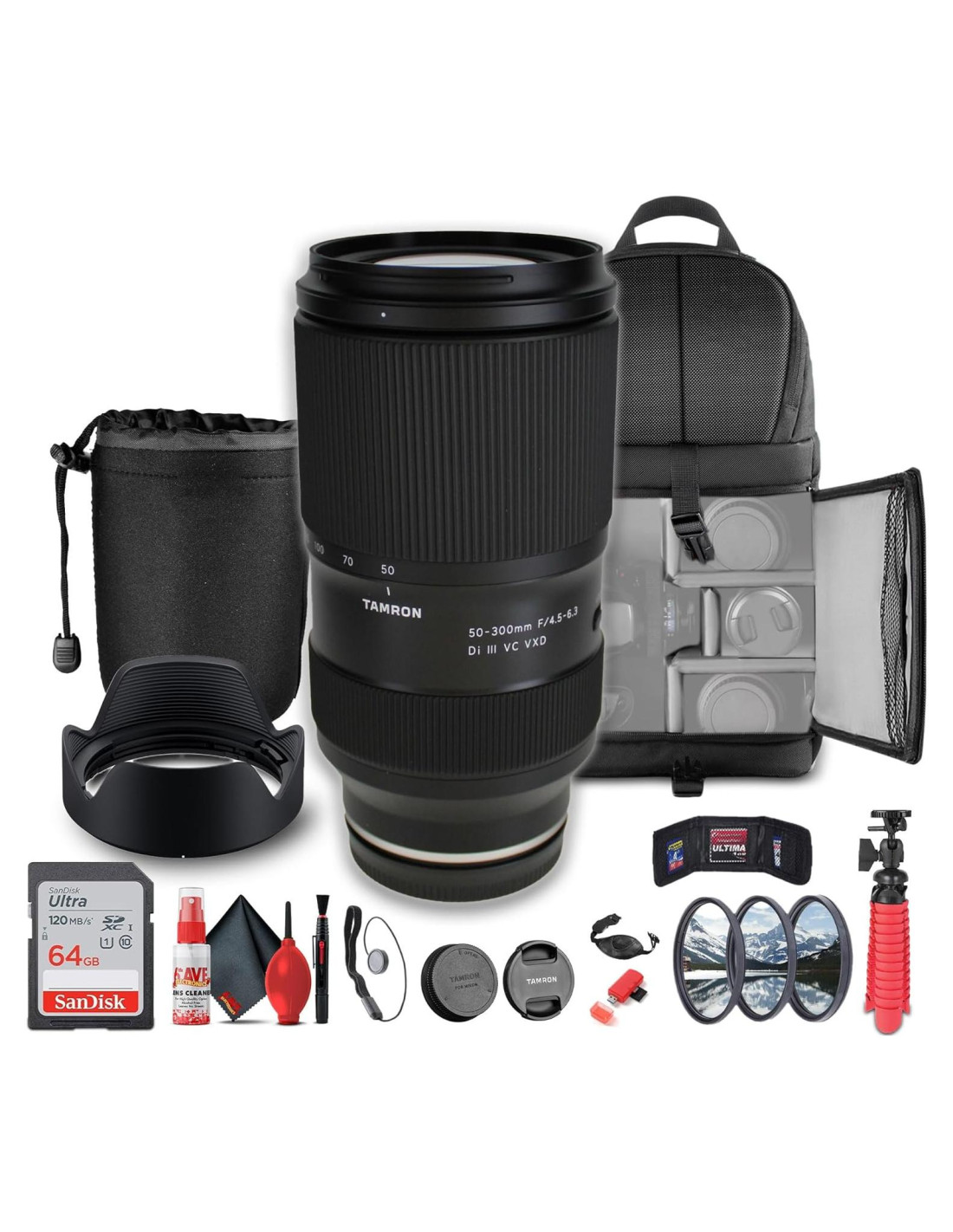 - El paquete incluye: Lente Tamron 50-300mm f/4.5-6.3 Di III VC VXD para Cámaras Sin Espejo (Sony E), Tarjeta de Memoria Ultra de 64GB, Kit de Filtros de 67mm, Mochila Pro Sling, Funda para Lente, Trípode Flexible de 30.48 cm, Sujetador de Tapas, Kit de Limpieza, Cartera para Tarjeta de Memoria, Lector de Tarjetas de Memoria, Correa de Mano