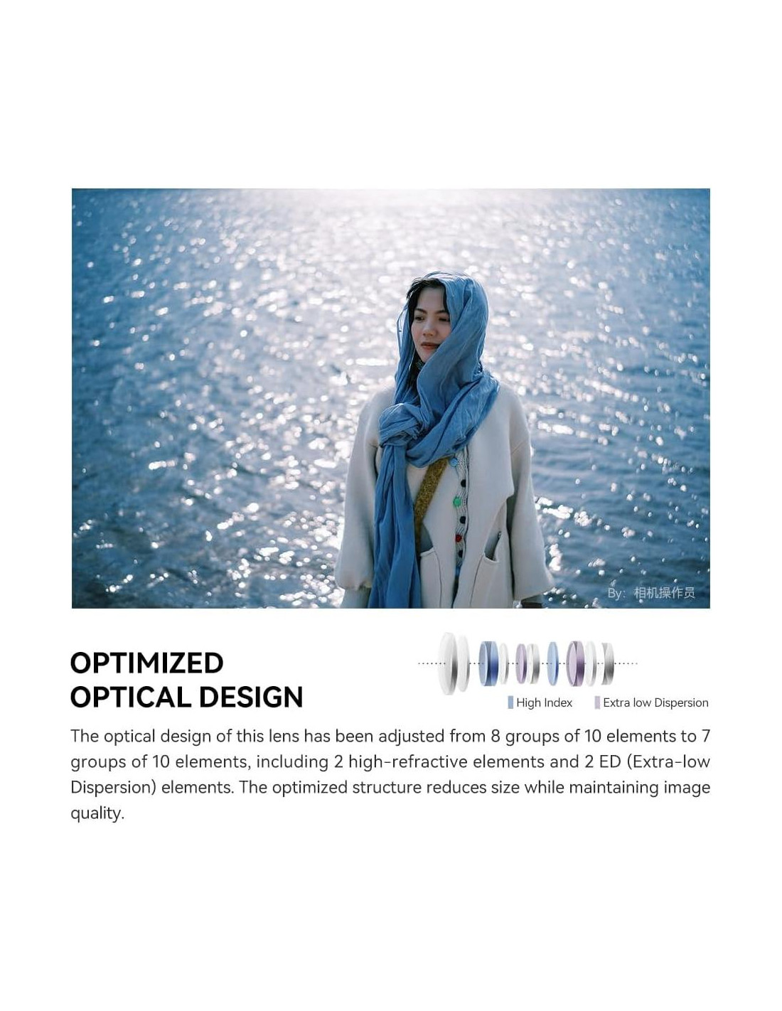 - Diseño Óptico Optimizado: El diseño óptico de esta lente se ha ajustado de 8 grupos de 10 elementos a 7 grupos de 10 elementos, incluyendo 2 elementos de alta refracción y 2 elementos ED (Dispersión Extra Baja). La estructura optimizada reduce el tamaño mientras mantiene la calidad de imagen.