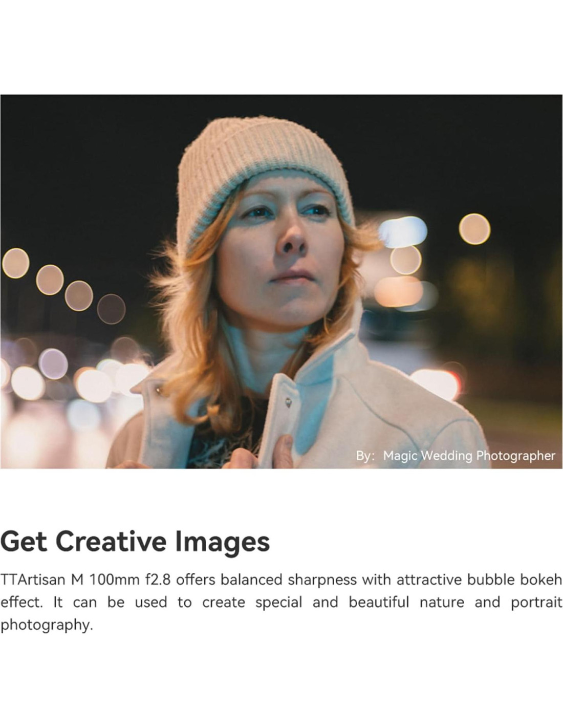 - Montura Compatible: Diseñada para montura M de Leica, la TTArtisan 100mm f2.8 se puede adaptar a cámaras Sony, Fuji, Canon, Nikon, Hasselblad y más con un adaptador (Nota: Anillo adaptador vendido por separado)
