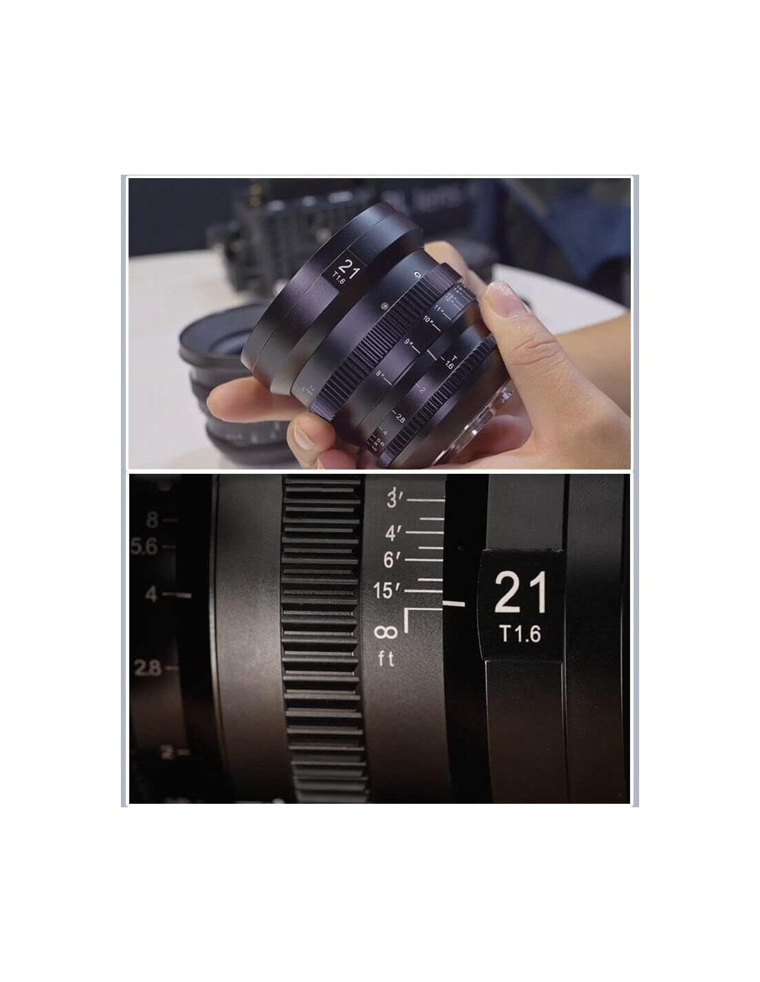 - Este 21mm T1.6 tiene montura E, montura M4/3 y montura Fuji X. Es de enfoque manual y apertura infinita. Tiene una rosca de filtro frontal de 82mm, un diámetro frontal de 85mm, un anillo de enfoque y un anillo de apertura con un engranaje de 0.8Mod, que es fácil de conectar al sistema de follow focus.