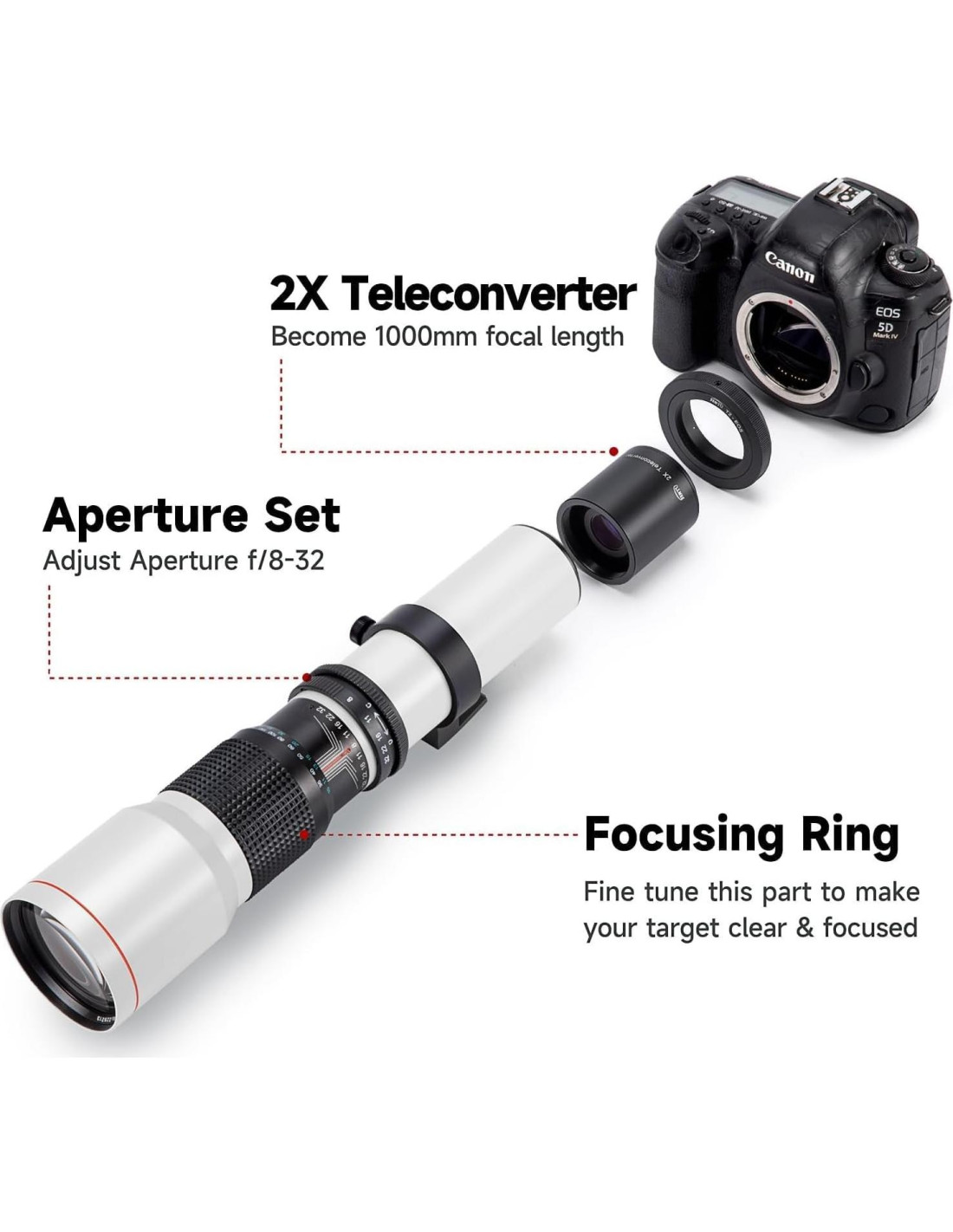 Una herramienta esencial para fotógrafos, longitud focal telefoto de alta potencia de 500mm, agregar 2X Teleconvertidor duplica la potencia de su lente a 1000mm. Cristal de baja dispersión de alto índice y multi-revestido importado, rosca para filtro: 67mm, lente telefoto de enfoque manual se puede usar para cámaras DSLR/SLR/sin espejo