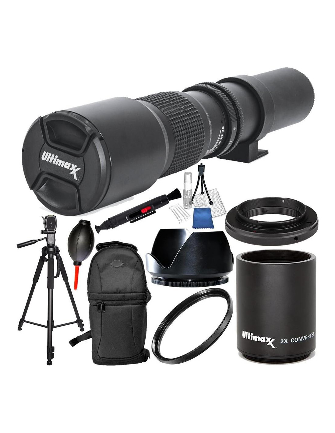El lente telefoto preset de alto poder multi recubierto de 500mm f/8.0 de Ultimaxx está fabricado con precisión en una construcción de aleación de aluminio liviano. La óptica multi recubierta, de alto índice / baja dispersión, asegura imágenes prácticamente libres de destellos, resultando en imágenes nítidas, detalladas y de alto contraste, incluso en las condiciones de iluminación más adversas. Las configuraciones de apertura de f/8.0 a f/32 mantienen un rango completo de exposición y configuraciones de profundidad. Diseñado para maximizar las tomas de día y de noche al proporcionar la máxima transmisión de luz e imagen con mínima distorsión. Este lente cuenta con un soporte de trípode giratorio, tapas de lente delantera y trasera y un conveniente estuche de transporte suave. Este kit incluye: Lente Telefoto Preset de Alto Poder Multi Recubierto de 500mm f/8.0 de Ultimaxx Accesorios del fabricante Convertidor Tele 2.0X Adaptador T-Mount para Canon Filtro UV Capucha de lente Mochila de trípode de 60'' Bolígrafo de limpieza de lente Kit de limpieza inicial
