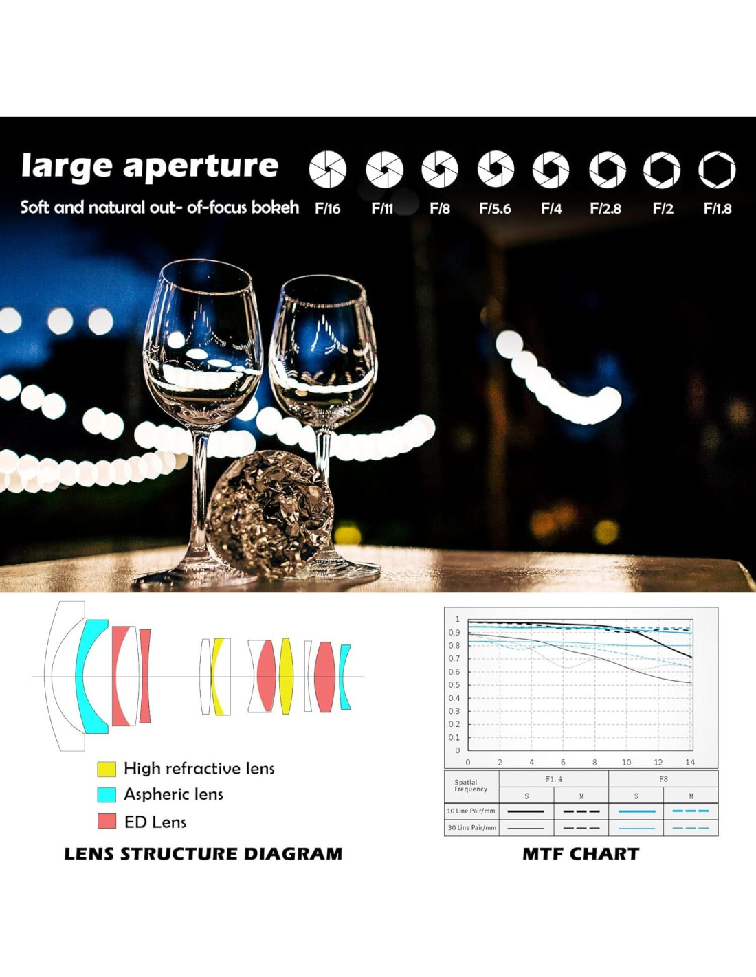 - La lente de máxima apertura brillante F1.4 puede capturar un encantador efecto bokeh de fondo, incluso en condiciones de poca luz y la fotografía en interiores también puede producir un alto nivel de trabajo.