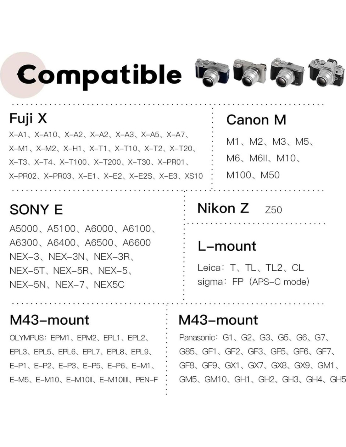 - [Sistema de Compatibilidad] Es compatible con cámaras OLYMPUS/Panasonic Micro 4/3 MFT: EPM1 EPM2 EPL1 EPL2 EPL3 EPL5 EPL6 EPL7 EPL8 EPL9 E-P1 E-P2 E-P3 E-P5 E-P6 E-M1 E-M5 E-M10 E-M10II E-M10IV PEN-F G1 G2 G3 G5 G6 G7 G85 GF1 GF2 GF3 GF5 GF6 GF7 GF8 GF9 GX1 GX7 GX8 GX9 GM1 GM5 GM10 GH1 GH2 GH3 GH4 GH5