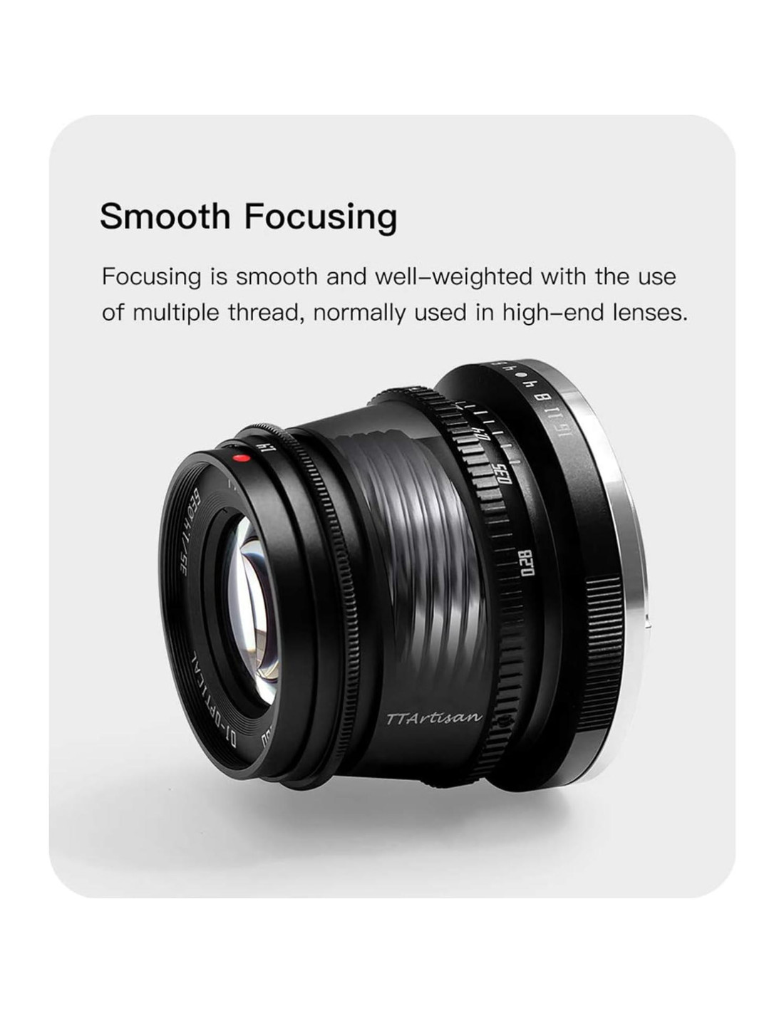 - Distancia de Enfoque Cercana: El diseño de enfoque manual del lente TTArtisan 35mm f1.4 permite trabajar con sujetos tan cerca como 11in (0.28m), ampliando las posibilidades creativas y haciendo que tus tomas sean más atractivas