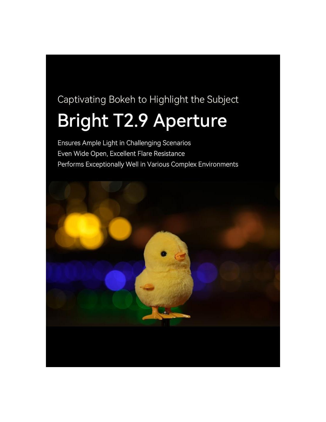 - T2.9 Apertura Grande Brillante: En la oscura noche con poca luz, puedes capturar fácilmente imágenes sorprendentemente nítidas con la gran apertura de T2.9. Excelente Resistencia a Flare Desempeña Excepcionalmente Bien en Diversos Entornos Complejos.