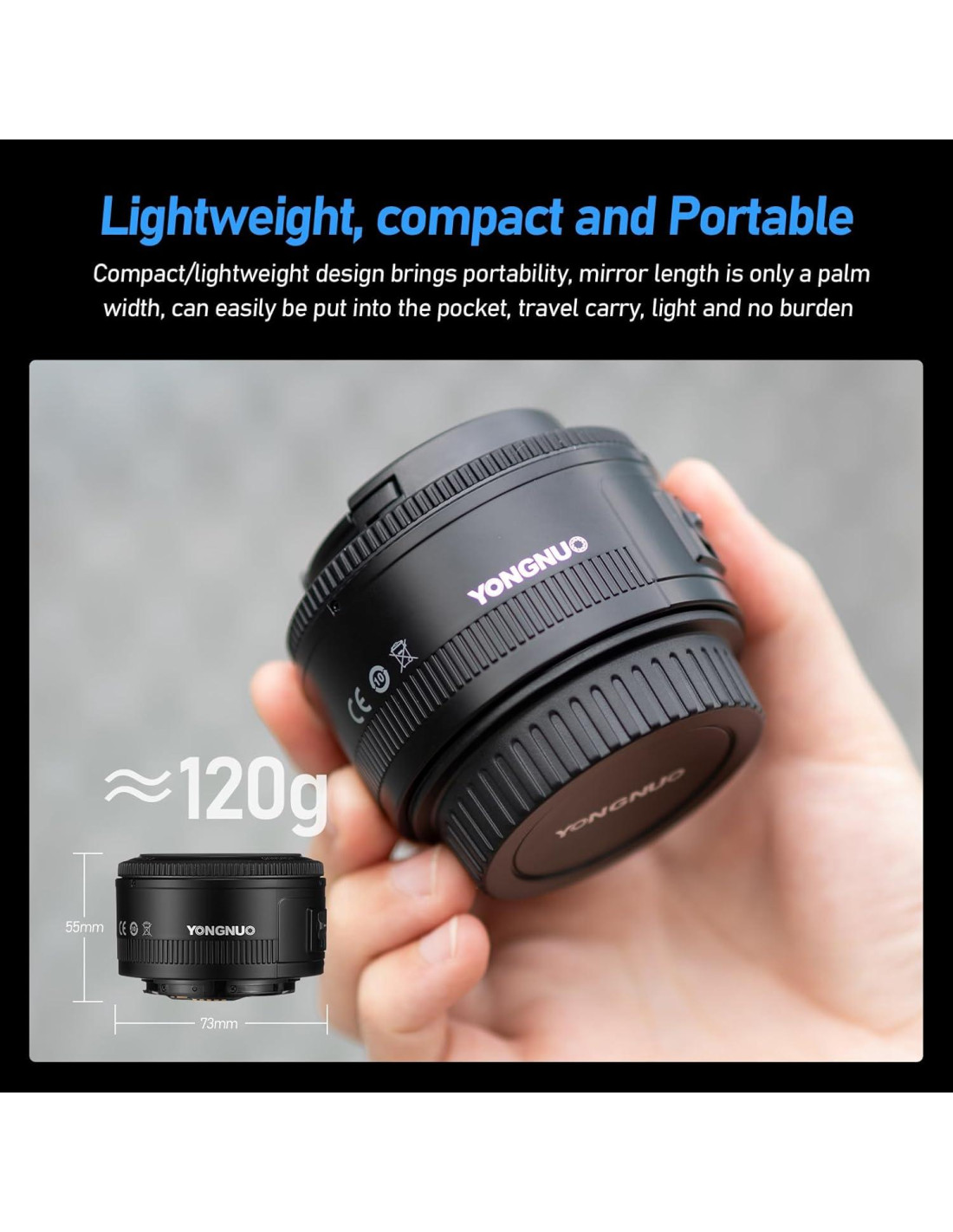 - [50mm F1.8] Lente de cámara YONGNUO 50mm F1.8 restaura el segmento focal de la perspectiva del ojo humano para fotografía callejera auténtica y grabación documental. Logra un encuadre 3X más cercano en comparación con lentes de kit con una distancia mínima de enfoque de 0.45m (1.5ft), ideal para blogs de comida y tomas de detalles de productos
