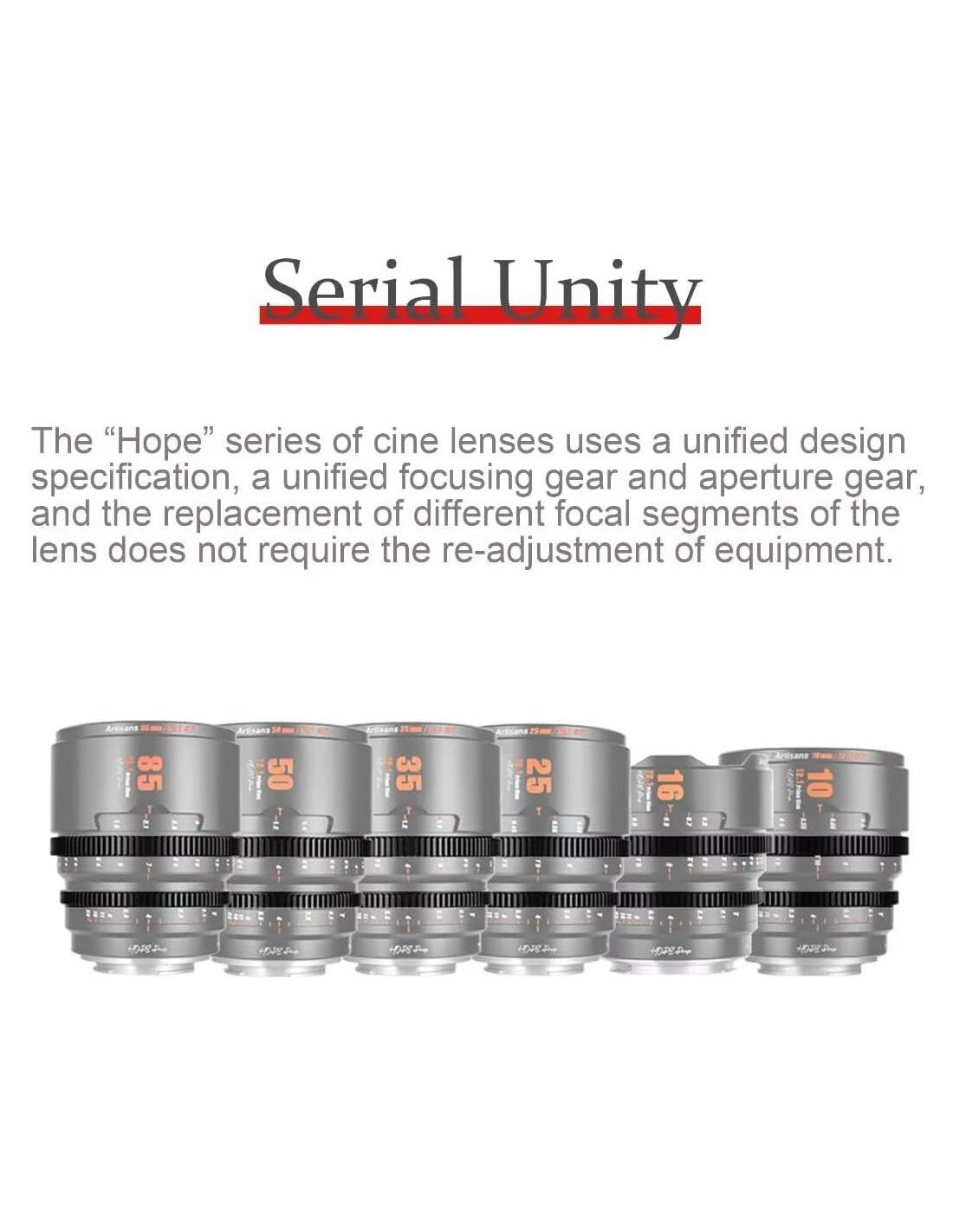 - [6 LONGITUDES FOCAL DISPONIBLES] Las lentes de cine de la serie Hope Prime cuentan con seis longitudes focales: 10mm, 16mm, 25mm, 35mm, 50mm y 85mm, atendiendo a una amplia gama de necesidades fotográficas desde gran angular hasta telefoto medio.