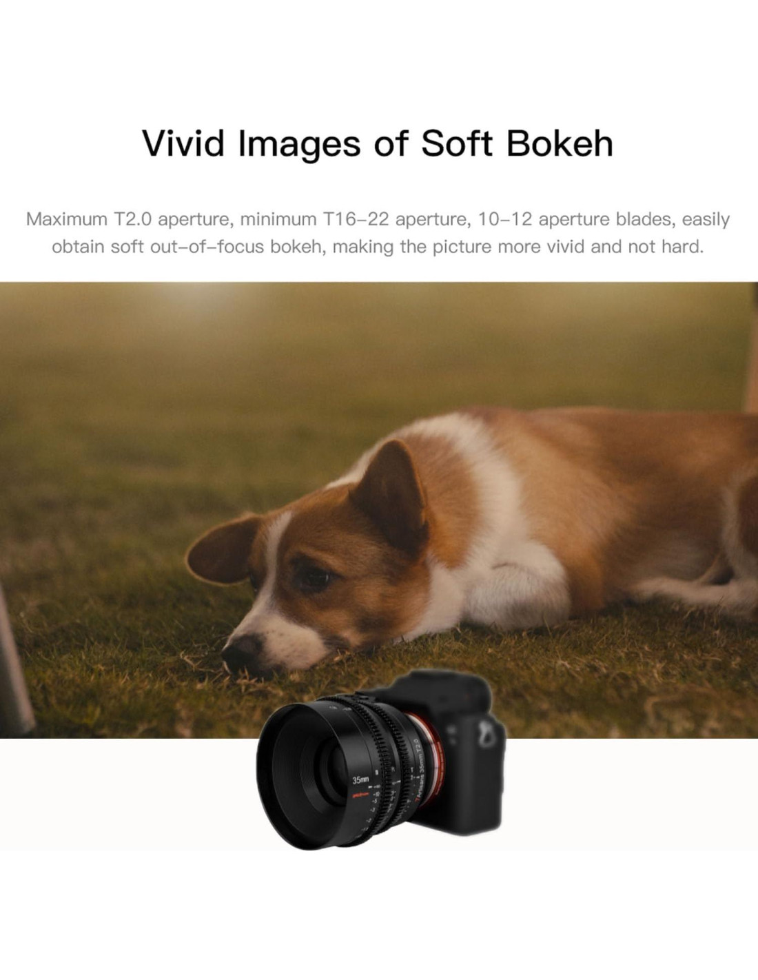 - Gran Apertura T2.0 La serie 'Spectrum' ofrece una apertura constante máxima de T2.0 y mínima de T22, la cantidad de luz que entra es siempre constante, capturando imágenes brillantes en condiciones de poca luz, 9 hojas de apertura para crear un bokeh suave y una transición de enfoque natural, la imagen no es dura