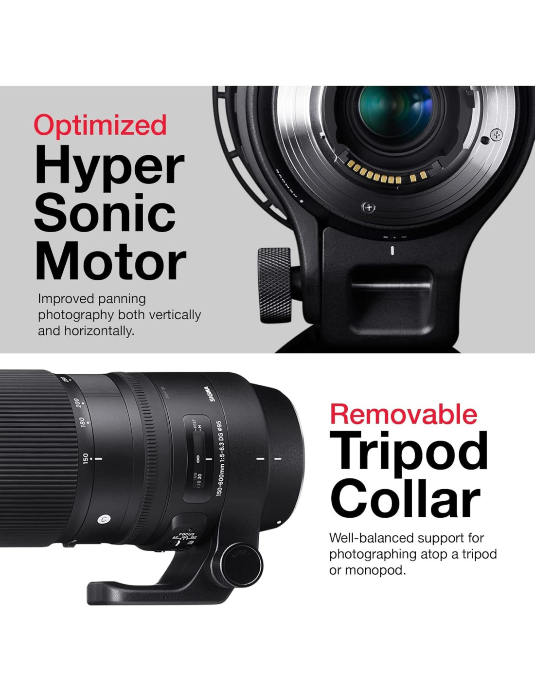 - EXCELENTE VALOR DEL PAQUETE - Lente Sigma 150-600mm F/5-6.3 DG OS HSM Contemporary para Canon, Tapa Frontal del Lente, Tapa Trasera del Lente, Collar de Trípode, Parasol del Lente, Funda Protectora, Funda Acolchada con Cremallera y Correa, 2 x Tarjetas de Memoria SanDisk 64GB Quick Transfer, y paño de limpieza. Peso total: 1.93 kg.