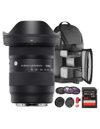 - El paquete incluye: Sigma 16-28mm f/2.8 DG DN Lente Contemporánea (Sony E), Mochila, Tarjeta de Memoria, Lector de Tarjetas, Kit de Filtros