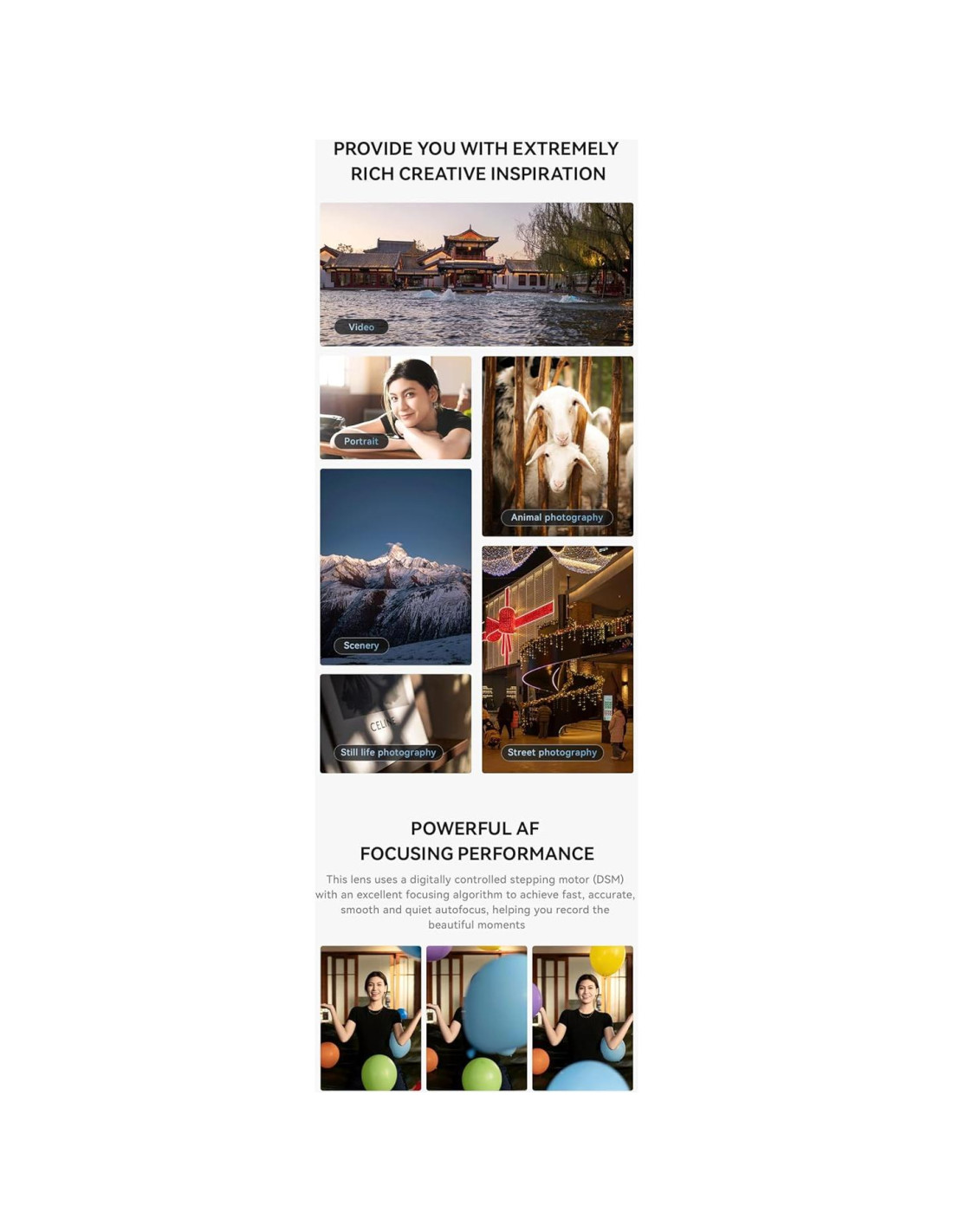 - [Interruptor SW I / II y actualización de firmware por USB] Con el interruptor SW I/II, el modo de enfoque AF/MF se puede cambiar rápidamente. Al mismo tiempo, este botón también puede funcionar como un interruptor para control remoto inalámbrico. El lente también está equipado con un puerto USB Tipo-C, los usuarios pueden descargar el firmware más reciente para actualizar el lente y mantenerlo en su mejor rendimiento.