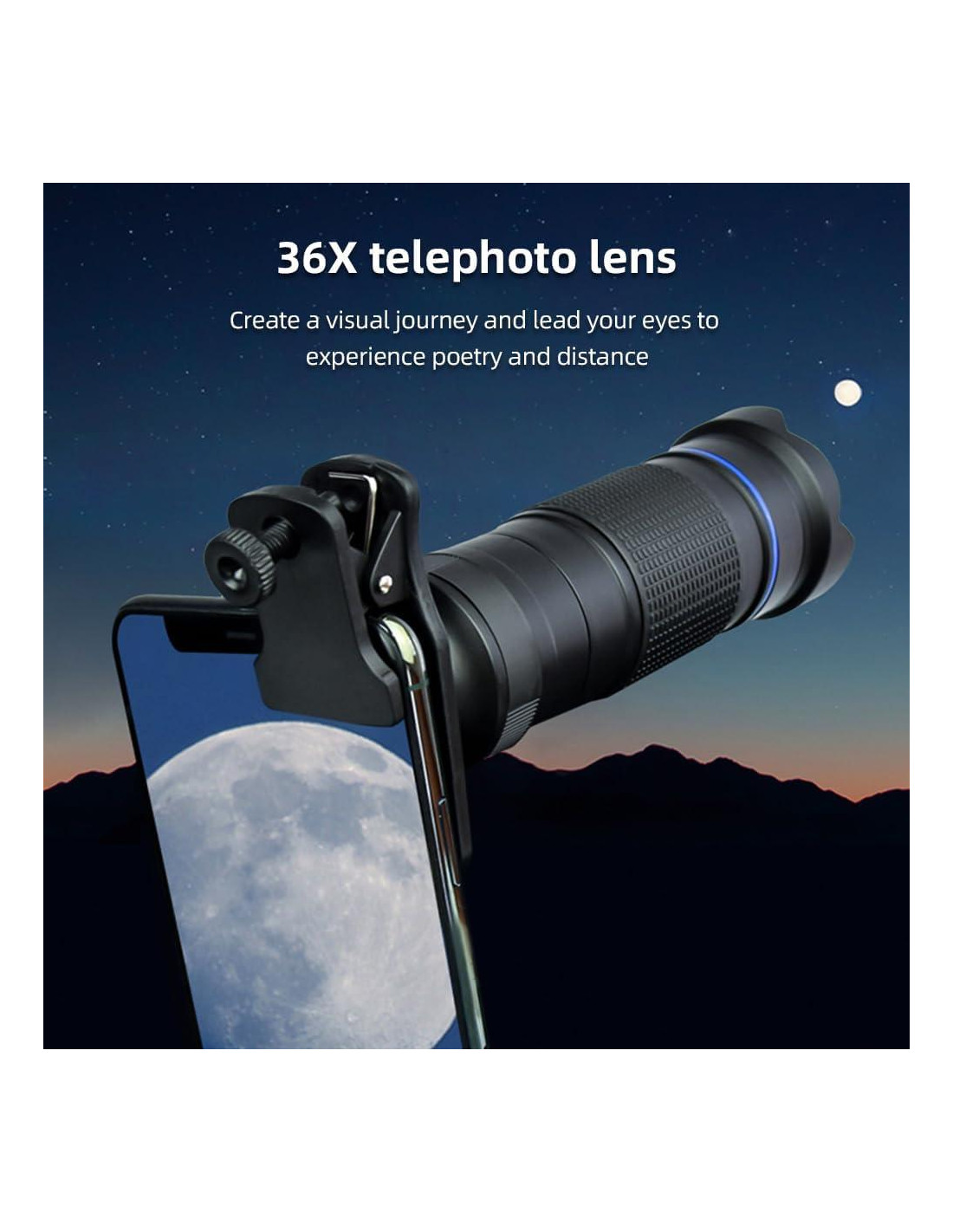 - [Magnificación 36X para una Visualización Excepcional] Con una potente magnificación de 36X, diseño compacto, alta resolución y sin viñeteo, esta lente telefoto ofrece experiencias de visualización inigualables y portabilidad sin esfuerzo dondequiera que te lleven tus aventuras.