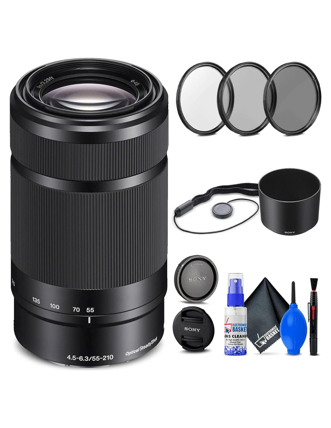 - Artículos incluidos: 1 x Sony E 55-210mm f/4.5-6.3 OSS Lente (Negro), 1 x Kit de Filtros de 3 Piezas de 49mm, 1 x Sujetador de Tapa de Lente, 1 x Kit de Limpieza