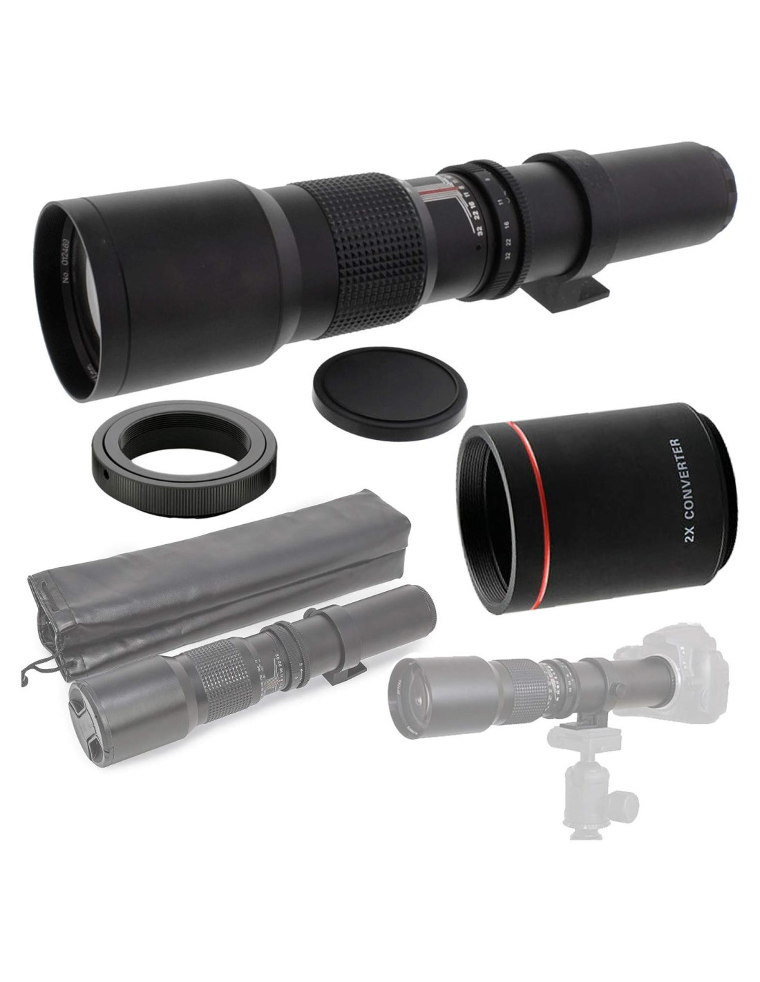 Compatible con cámaras SLR / DSLR, el lente telefoto preestablecido de 500mm f/8.0 de alta potencia y multi revestido está fabricado con una construcción de aleación de aluminio liviano. La óptica de alto índice / baja dispersión, multi revestida y anti-reflejo asegura imágenes prácticamente libres de destellos, resultando en imágenes nítidas, detalladas y de alto contraste, incluso en las condiciones de iluminación más adversas. Las configuraciones de apertura de f/8.0 a f/32 mantienen un rango completo de exposición y configuraciones de profundidad. Diseñado para maximizar las tomas de día y de noche al proporcionar la máxima transmisión de luz e imagen con mínima distorsión. Este lente cuenta con un soporte de trípode giratorio, tapas de lente delantera y trasera y un conveniente estuche de transporte suave. El lente se adapta al cuerpo de su cámara utilizando el adaptador T incluido junto con el lente. Asegúrese de pedir el lente correcto para su cámara, ya que el adaptador T varía para diferentes marcas de cámaras DSLR. El paquete incluye: - Lente Telefoto Preestablecido de 500mm f/8-32 (enfoque manual solamente) - Adaptador T - Adaptador 2x
