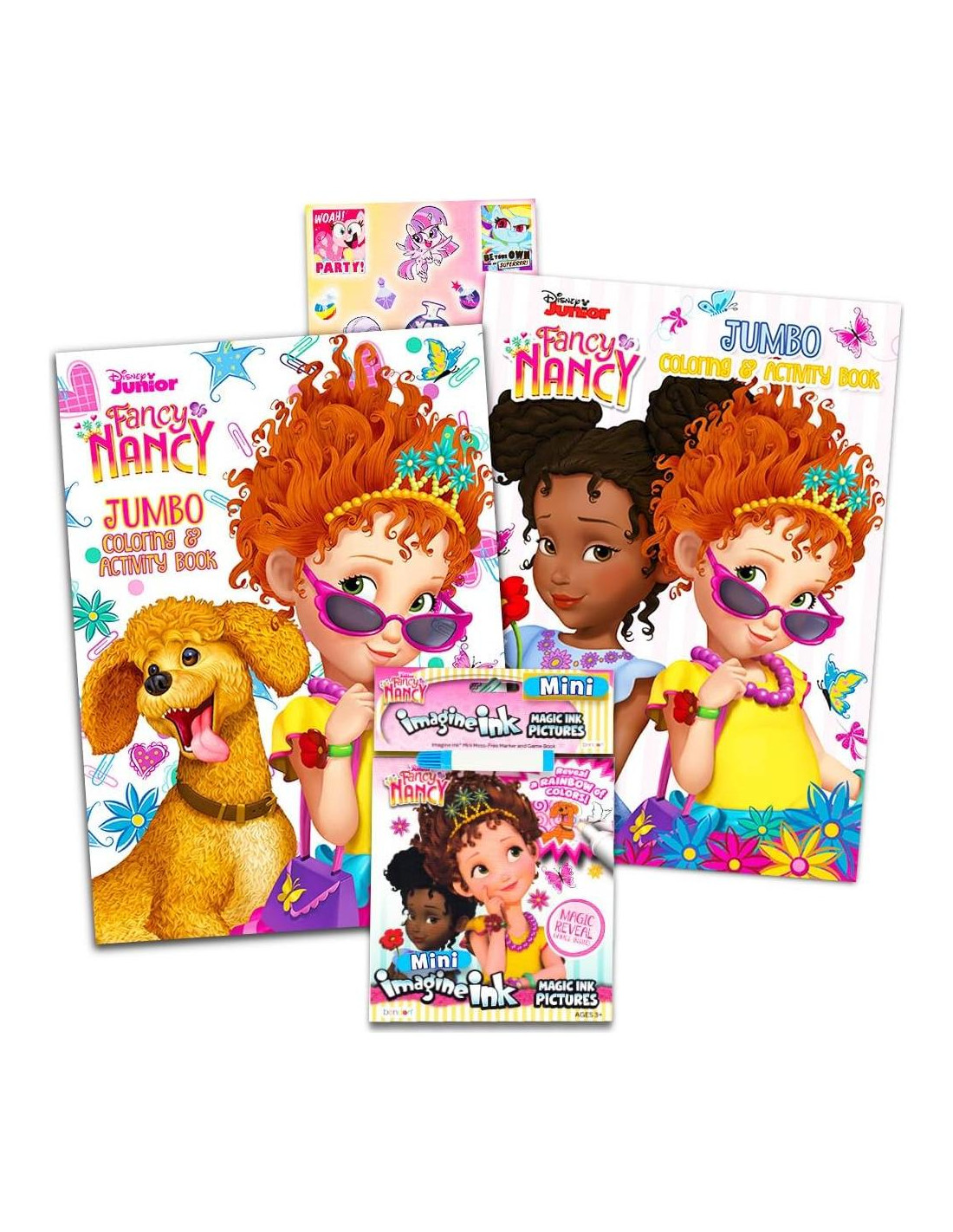 - Incluye: un mini paquete de juego de tinta imaginaria de Fancy Nancy de 5 páginas; 2 libros de colorear jumbo de Fancy Nancy.