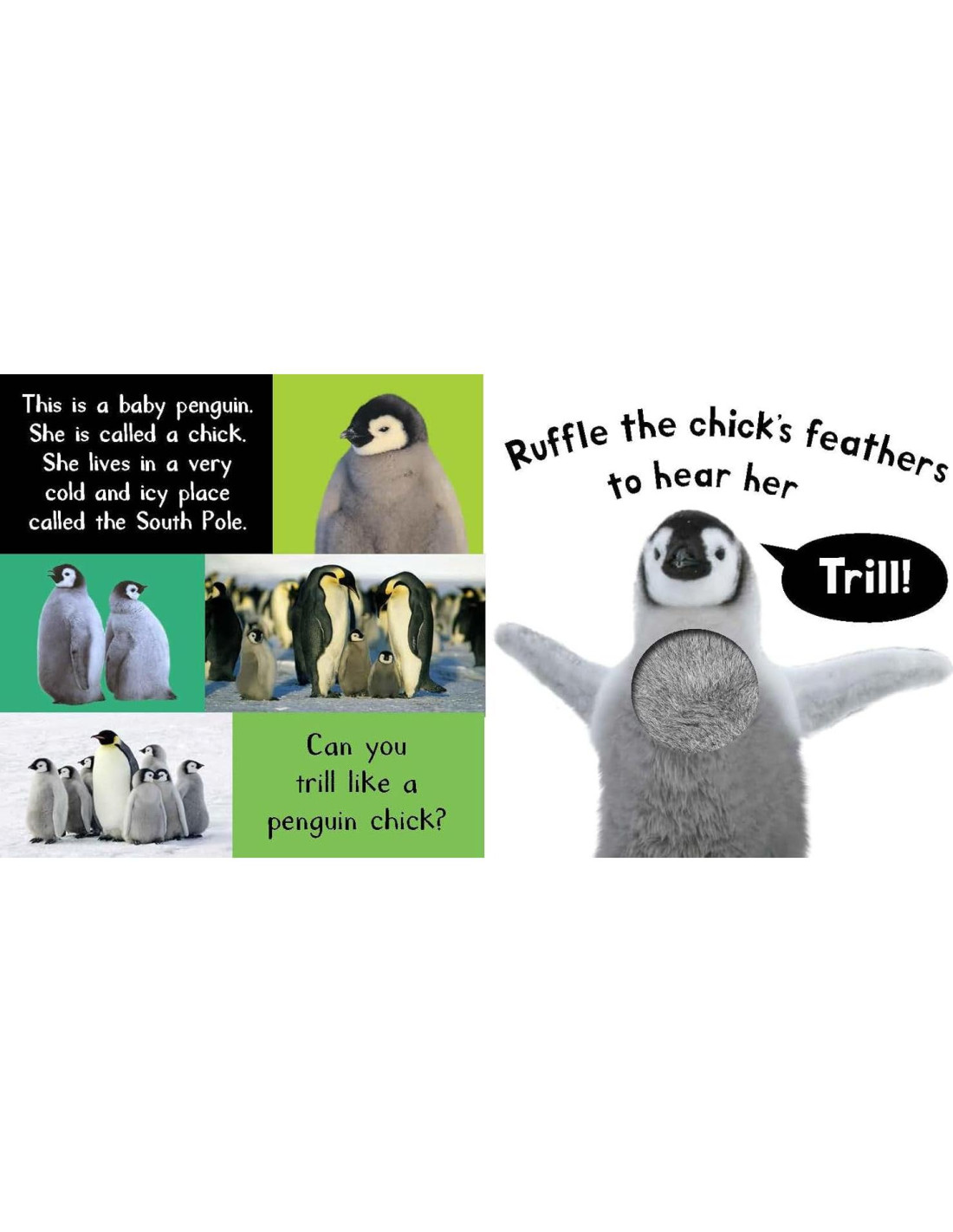 Los jóvenes lectores adorarán sentir las diferentes texturas y escuchar los sonidos de los animales bebés en este libro de cartón interactivo y resistente diseñado para niños de 3 años en adelante. Incluye un interruptor de encendido/apagado en la contraportada para extender la vida de la batería. Toca, siente y escucha a los animales bebés en cada página de este libro de cartón interactivo y resistente, lleno de fotografías atractivas, texturas táctiles y adorables sonidos de animales bebés. Presiona las texturas para escuchar cinco sonidos realistas de animales bebés, con un botón en la última página para reproducir los cinco sonidos nuevamente!