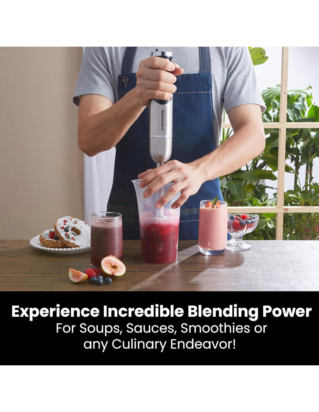 El Mezclador de Inmersión de Mano Elite Gourmet de 500 Watts hace que mezclar y combinar cualquier comida blanda sea una experiencia deliciosa. Es tan fácil y sin esfuerzo que cualquiera puede hacerlo. El cuerpo ligero y antideslizante junto con su ensamblaje de cuchillas de acero inoxidable de grado alimenticio es tan cómodo de sostener y controlar que cocinar en la cocina será divertido nuevamente. Mezcla una variedad de tus sopas gourmet favoritas, guacamole, batidos, masa para pasteles, salsas, salsas, adobos, aderezos para ensaladas, o incluso comida saludable para bebés hecha en casa con solo presionar un botón. Alimentado por un motor de 500 Watts de alta resistencia, tiene velocidades variables de un toque con Turbo, por lo que funciona rápido y de manera efectiva, mezclando expertamente cualquier cosa que desees en una consistencia suave. Con su diseño delgado, el mezclador de mano es cómodo para todos los agarres y se adapta a la mayoría de los tazones de mezcla, ollas, vasos o utensilios de cocina. Es compacto pero potente para incluso los trabajos de mezcla más difíciles. Además, está diseñado de manera conveniente para desarmarse fácilmente, por lo que la limpieza y el almacenamiento son muy sencillos. Simplemente separa el ensamblaje de la cuchilla del cuerpo del motor y lava a mano el eje de acero inoxidable o colócalo en el lavavajillas. El cuerpo se puede limpiar fácilmente con un paño suave y húmedo. NOTA: PARA PREVENIR EL SOBRECALENTAMIENTO, OPERE EL MEZCLADOR DE MANO EN INTERVALOS DE UN MINUTO O MENOS.