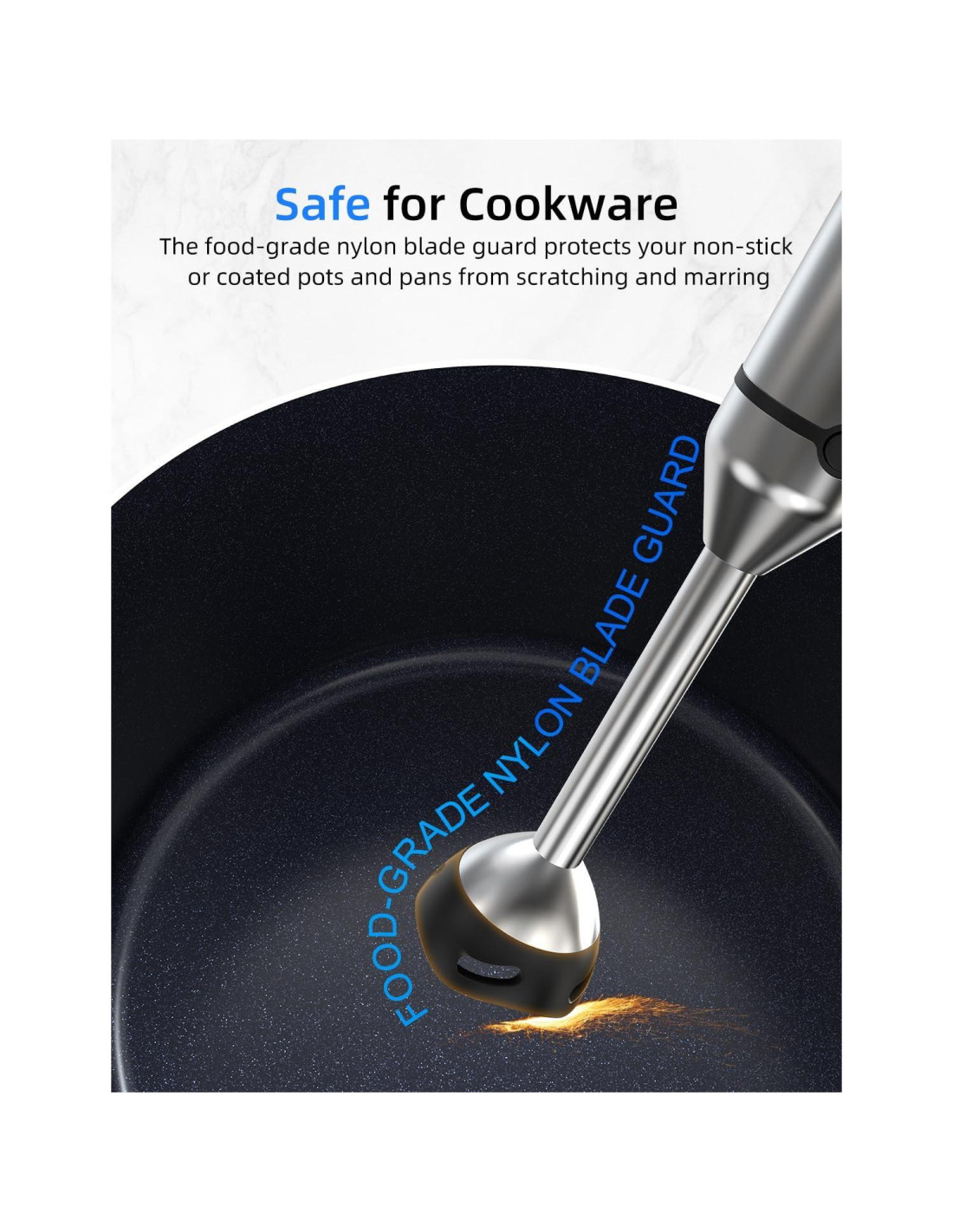 - Diseño Smart Stick: El agarre ergonómico y la operación con un solo toque permiten una mezcla fácil y cómoda directamente en ollas, tazones o jarras.