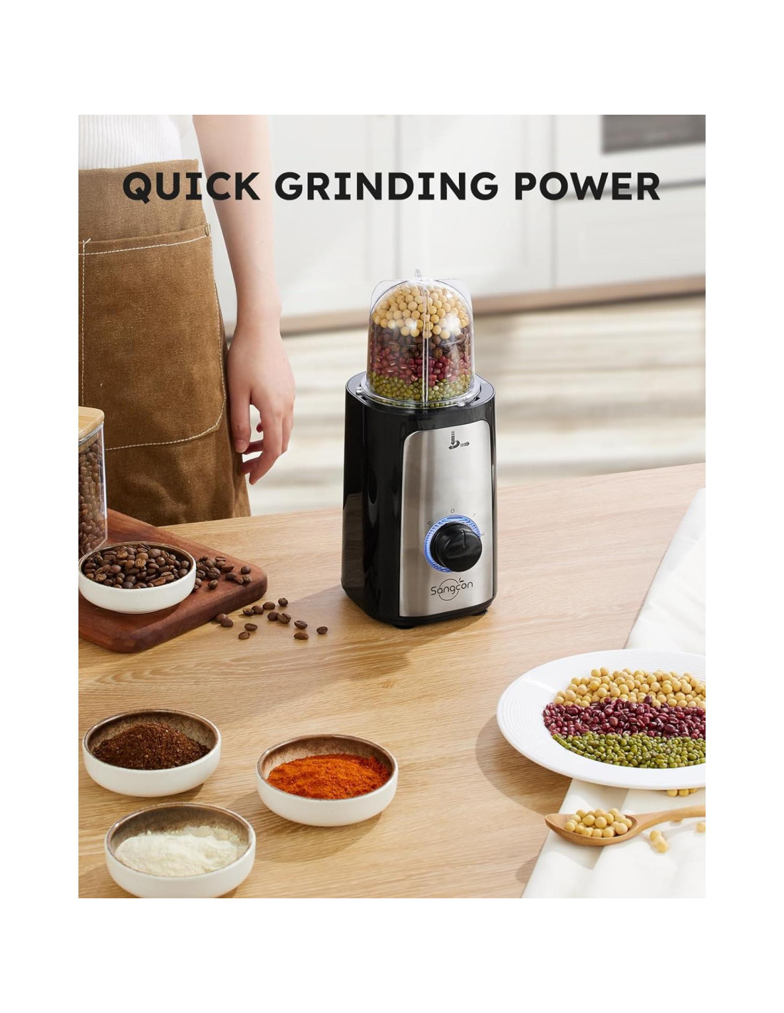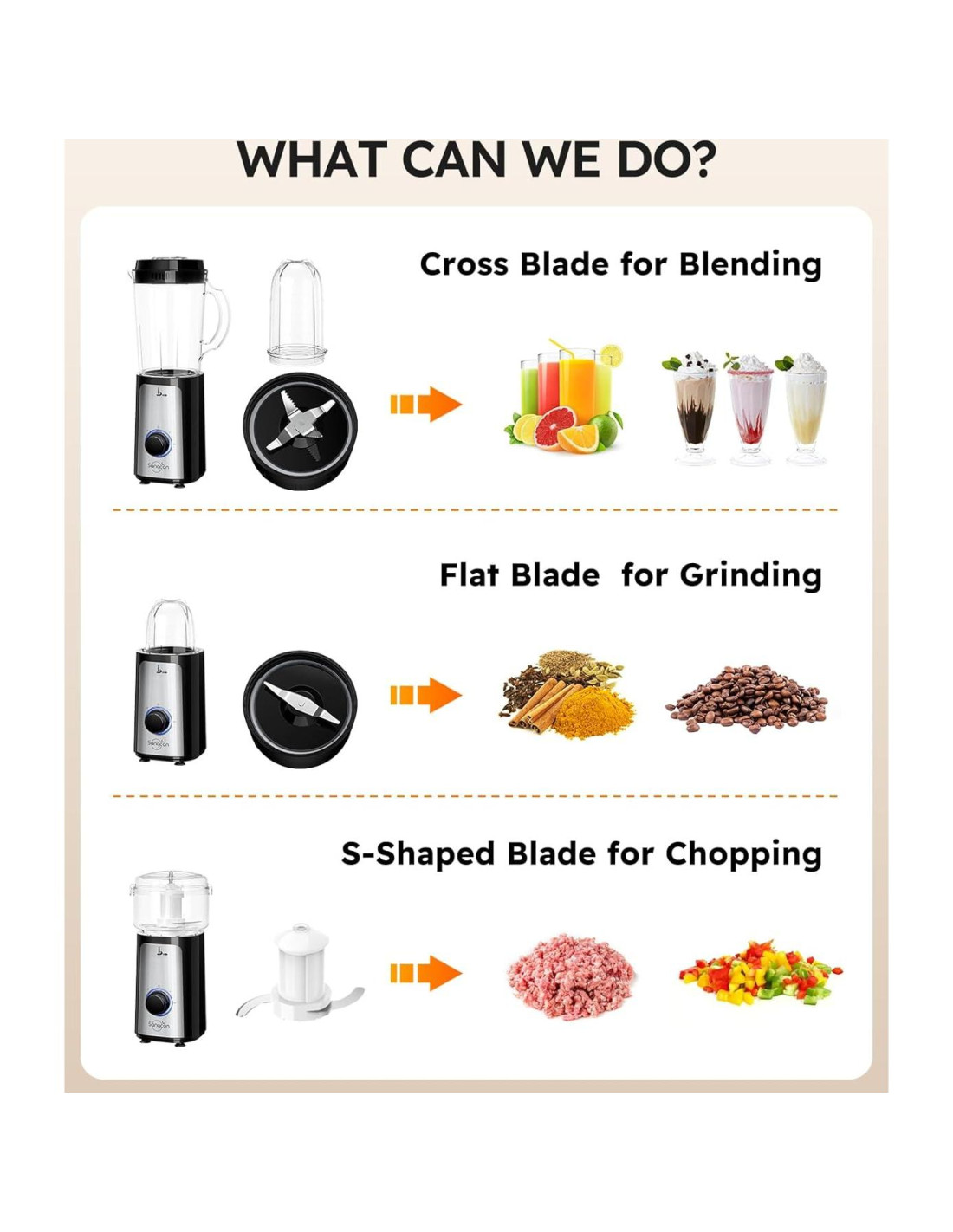 - [SENCILLO Y PRÁCTICO] La licuadora Sangcon 5 en 1 ofrece infinitas posibilidades con sus 4 recipientes y 3 tipos de cuchillas. El interruptor del motor está equipado con una luz LED azul, y hay opciones de 2 velocidades y un modo de pulso para brindarte infinitas posibilidades. Desde batidos y malteadas hasta jugos de frutas, jugos de verduras, pesto, salsas, carne picada, mantequilla de maní, leche de almendra/soja, café molido, polvo de especias, y más, esta licuadora puede manejar una amplia gama de tareas