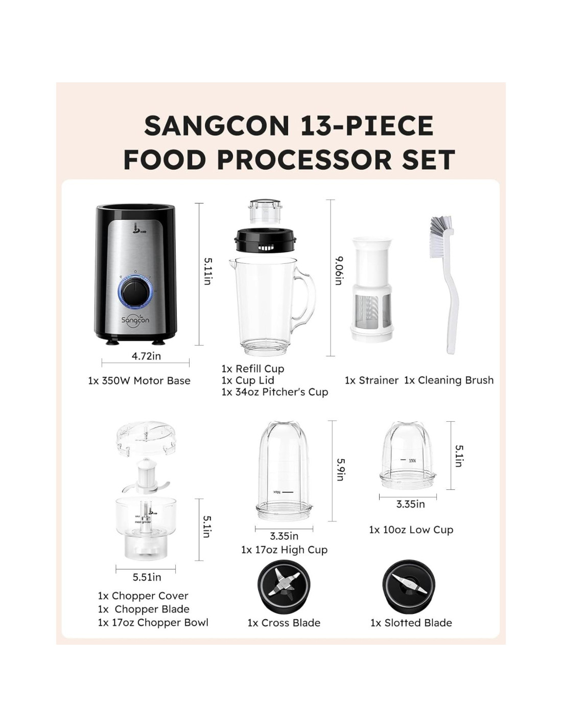 - [FÁCIL DE LIMPIAR] El set de procesador de alimentos Sangcon cuenta con un diseño modular para fácil ensamblaje y desensamblaje. Después de usar, simplemente enjuaga los tazones, jarras, tazas y cuchillas con agua. Todos los accesorios, excepto el motor, son aptos para lavavajillas. Nota: Por favor, ten cuidado al manejar cuchillas afiladas