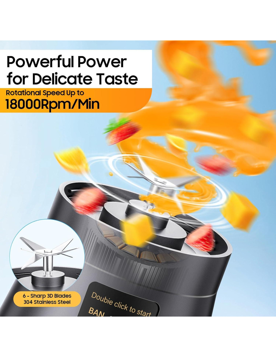 - [Usa los Pasos Correctamente] Paso 1: Corta la fruta en trozos pequeños y agrega hasta aproximadamente el 80% de la taza. Paso 2: Agrega agua o leche, de lo contrario no funcionará correctamente. Paso 3: Voltea la máquina para que las cuchillas estén completamente expuestas. Paso 4: Haz doble clic en el interruptor de inicio. Paso 5: Gira la cuchilla durante 1-2 segundos, luego coloca la máquina en posición vertical y agita la máquina mientras haces jugo.